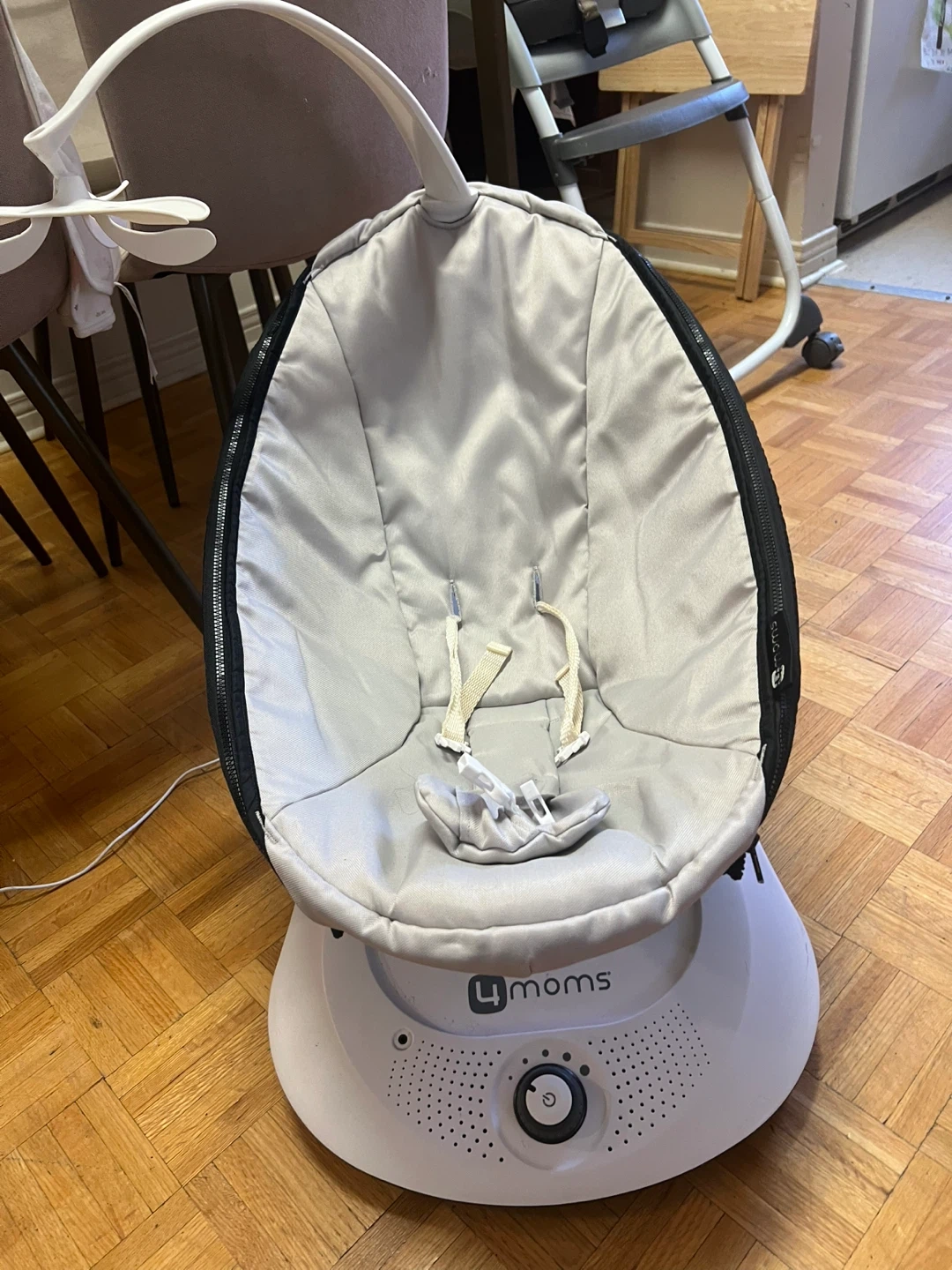 Selling a 4moms MamaRoo baby swing in great condition! This swing is designed to mimic the natural motions parents use when comforting their babies. It features multiple speeds and built-in sounds to help soothe your little one. Perfect for newborns up to six months!