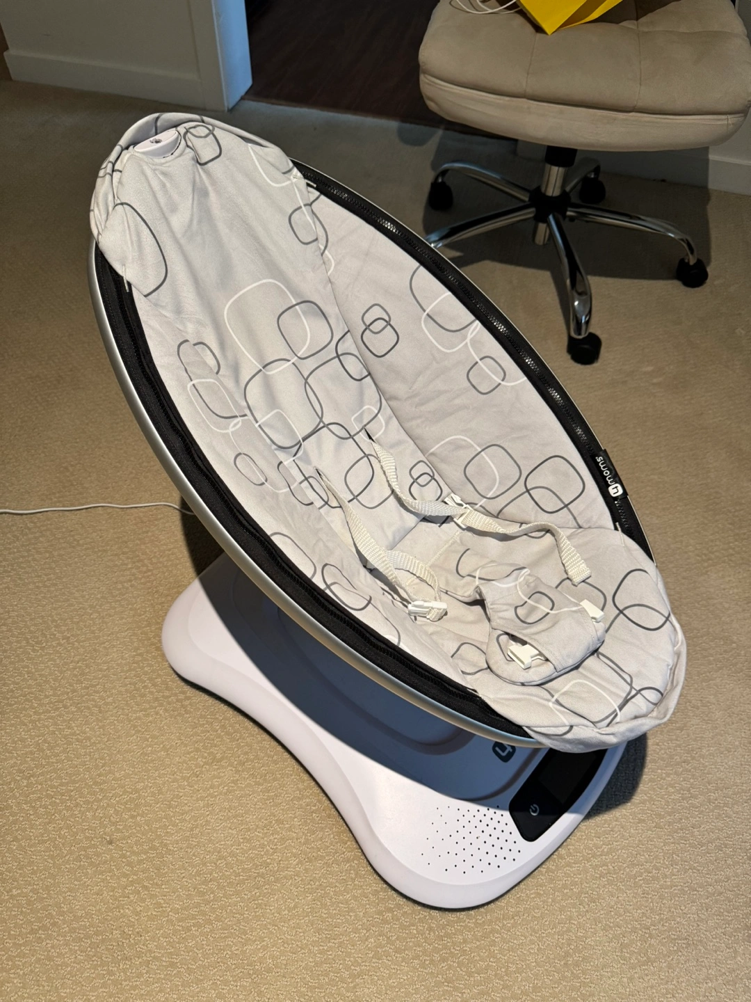 Selling a gently used 4moms mamaRoo baby swing. It's in great condition and ready for a new little one! This swing is designed to mimic the natural motions parents use to comfort their babies. It has multiple speeds and built-in sounds to soothe your baby. Missing toy bar so priced accordingly.