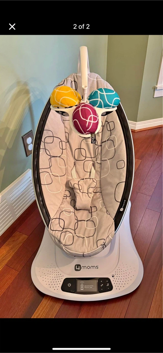 10Selling a 4moms MamaRoo baby swing. It's in great shape and ready for a new home! This swing is designed to mimic the natural motions parents use to comfort their baby. It features multiple speeds and built-in sounds to soothe your little one