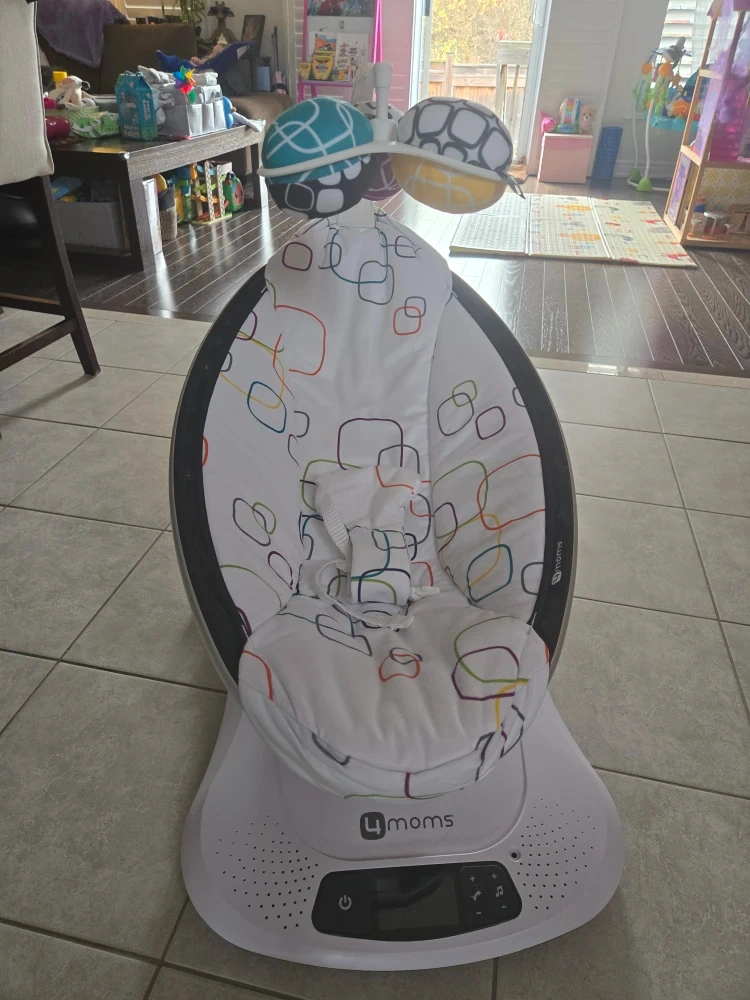 65Selling a 4moms MamaRoo baby swing. It's in excellent condition and ready for a new home. This swing has multiple motions and speeds to soothe your little one. The seat is white with a colourful geometric pattern. It also includes the mobile with colourful balls to entertain your baby
