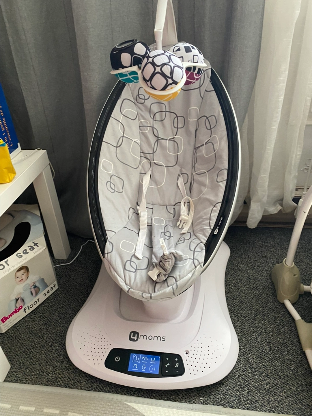 15Gently used 4moms mamaRoo baby swing. Features multiple speeds and sounds. Includes mobile with hanging toys. Great condition.