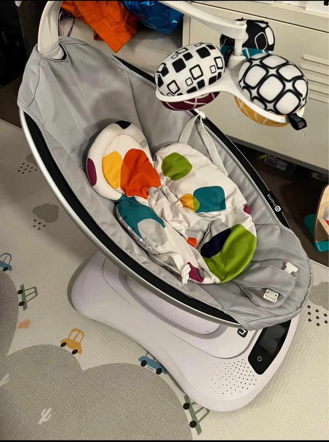The 4moms mamaRoo baby swing features a colourful, patterned insert and overhead toy mobile. The swing is grey and white, with a sleek, modern design. Pick up at Brow of the Hill near 10th and Royal, New Westminster.