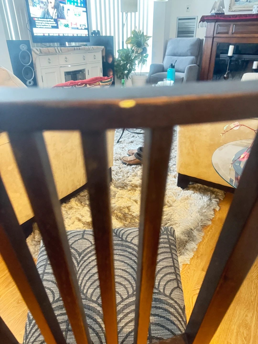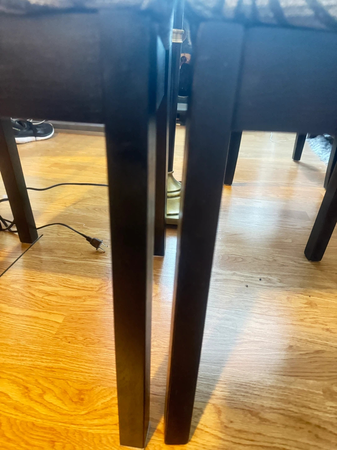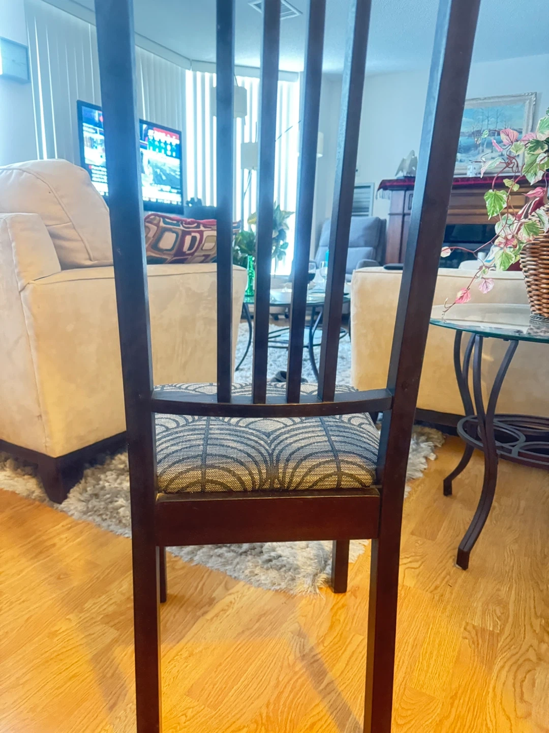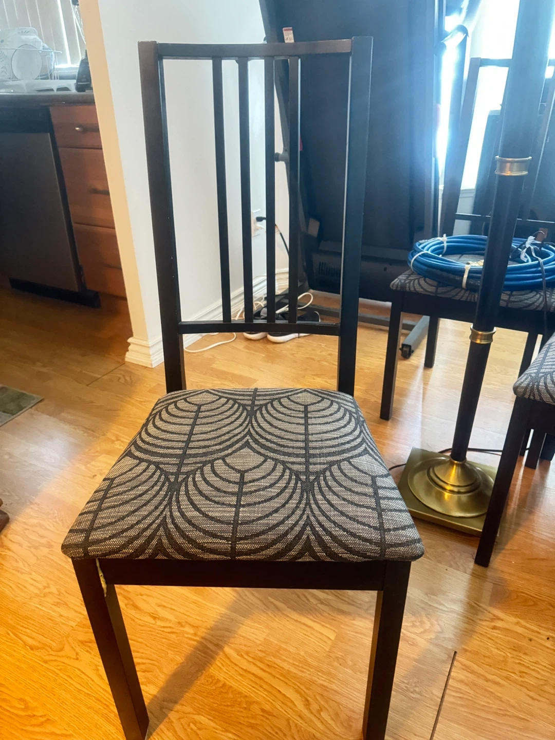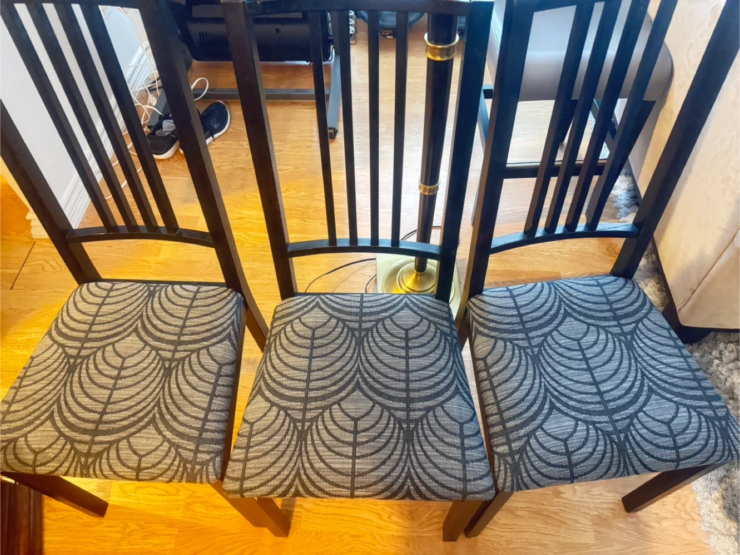Selling a set of three wooden dining chairs! They have a dark wood finish and patterned fabric seats. Great for adding extra seating to your dining area or kitchen