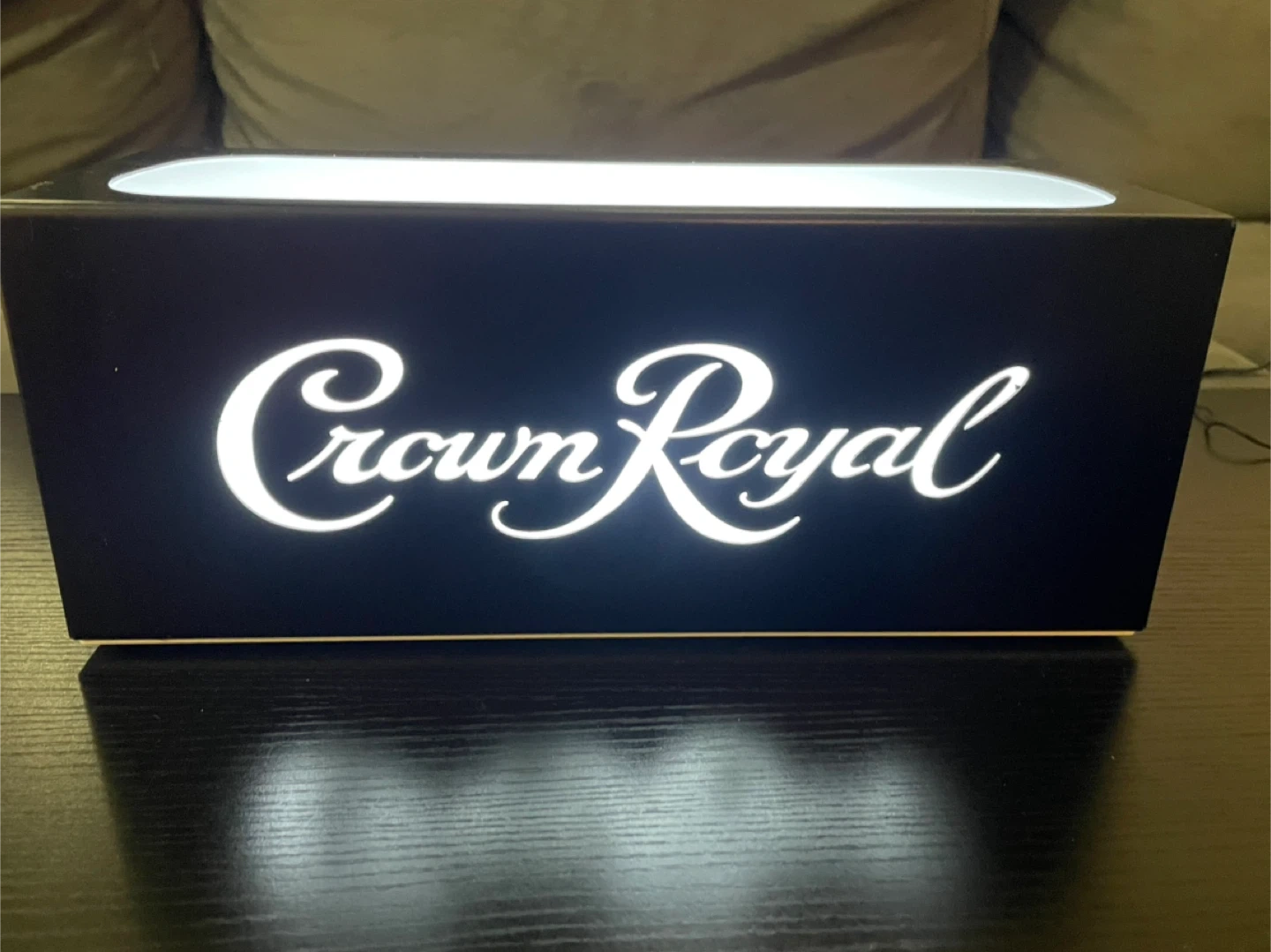 This Crown Royal lighted display box has the brand logo illuminated. It comes with a power adapter. Perfect for a bar or display area!