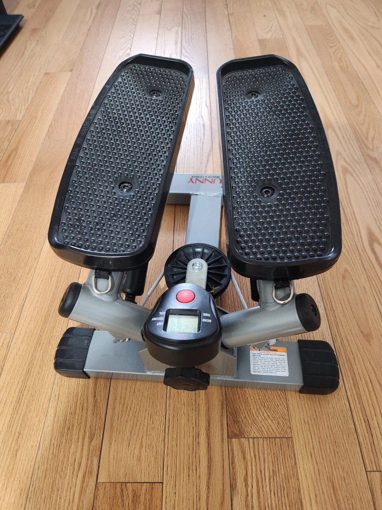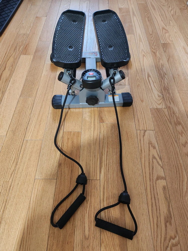 Compact and portable stepper with resistance training arm bands for a full leg and arm workout. Adjustable resistance for the stepper and LCD display shows step count, time and calories burned. Can be used at a standing desk while working as well.