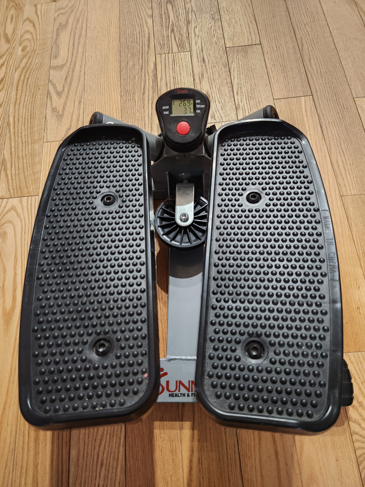 Compact and portable stepper with resistance training arm bands for a full leg and arm workout. Adjustable resistance for the stepper and LCD display shows step count, time and calories burned. Can be used at a standing desk while working as well.