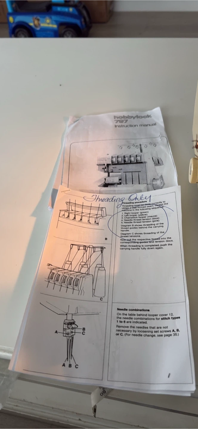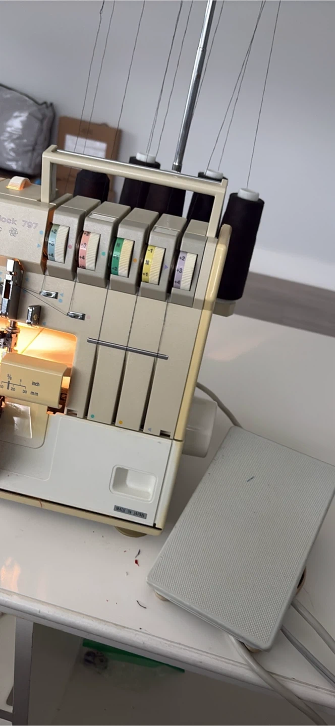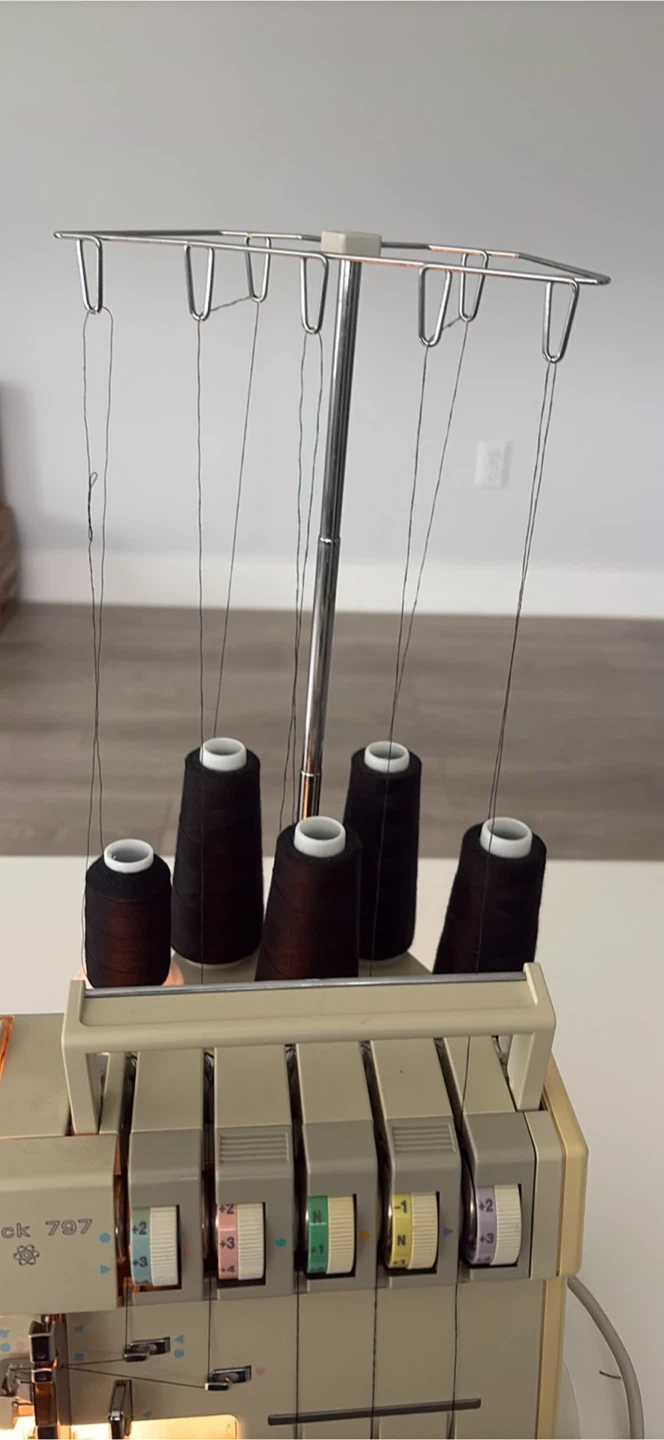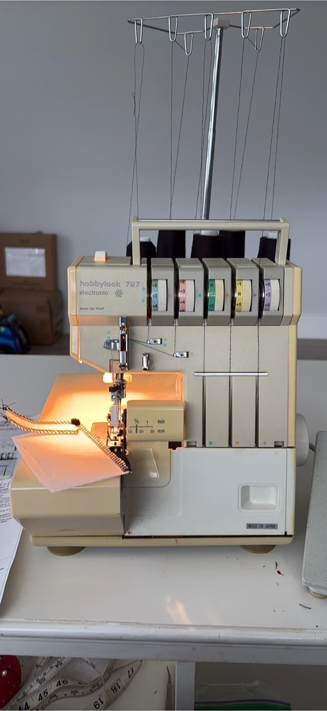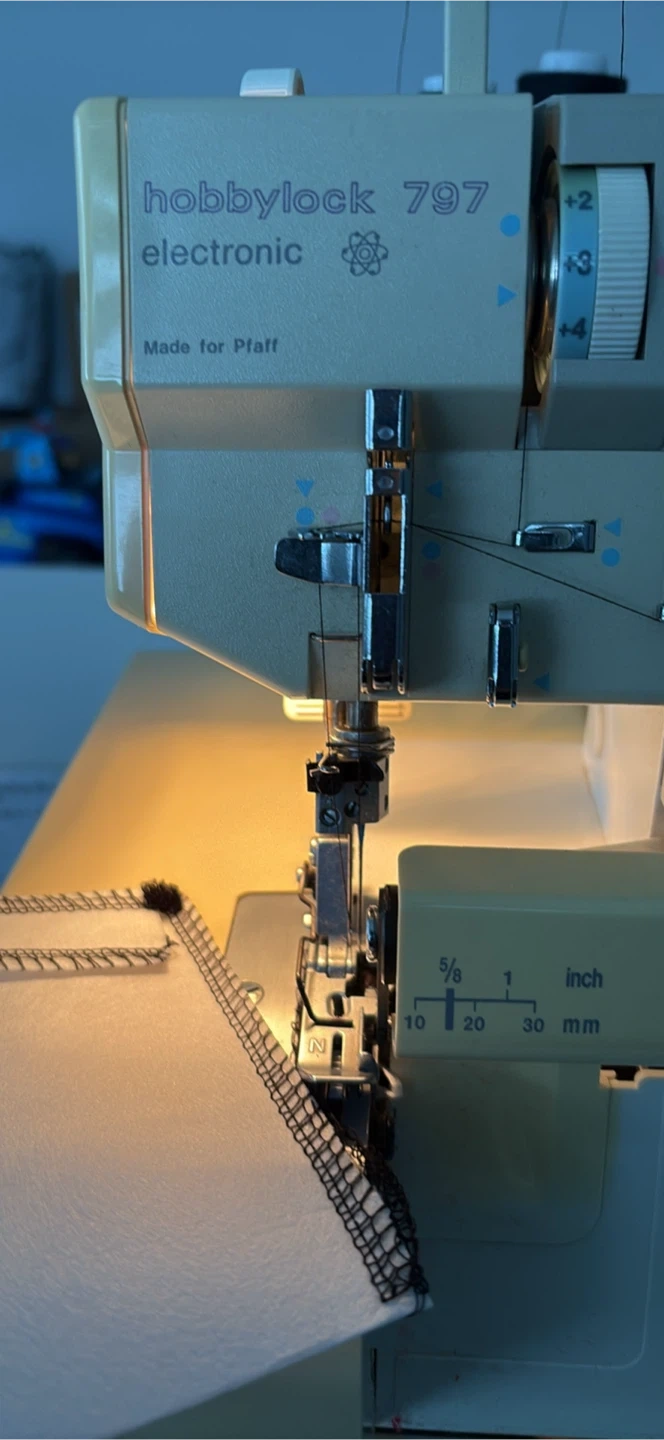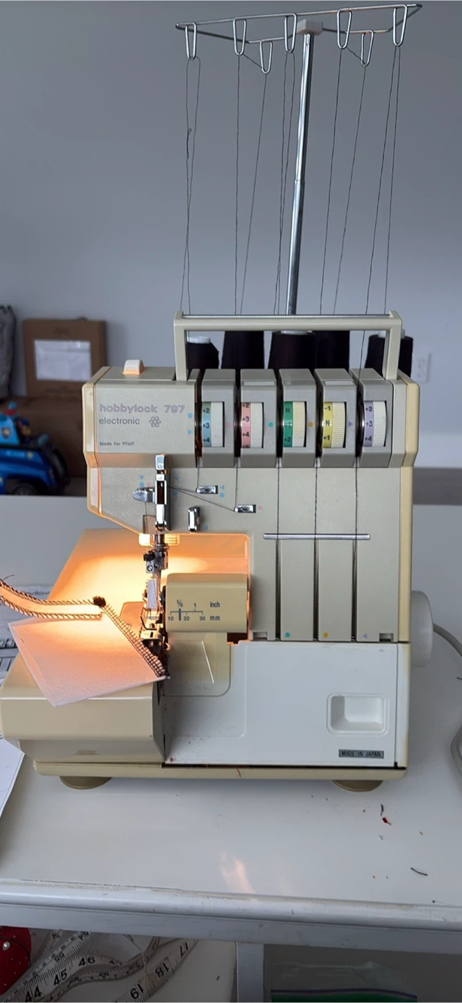This is a Hobbylock 797 electronic serger sewing machine. It's an "electronic" model. It comes with its original instruction manual. It's perfect for completing garment edges quickly and professionally!