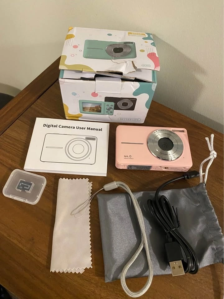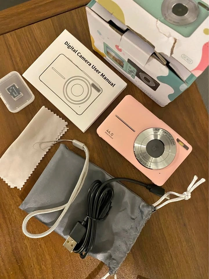 Cute pink digital camera with 44.0 megapixels and 16x zoom. Includes user manual, 32GB memory card, cleaning cloth, wrist strap, pouch, and charging cable.