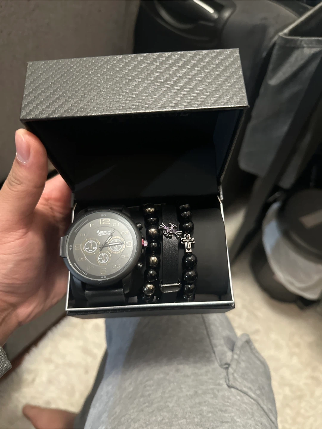 This set includes a black analog watch with a gray dial and a matching beaded bracelet. The watch has a black strap and features multiple subdials. It comes in a carbon fiber patterned gift box.