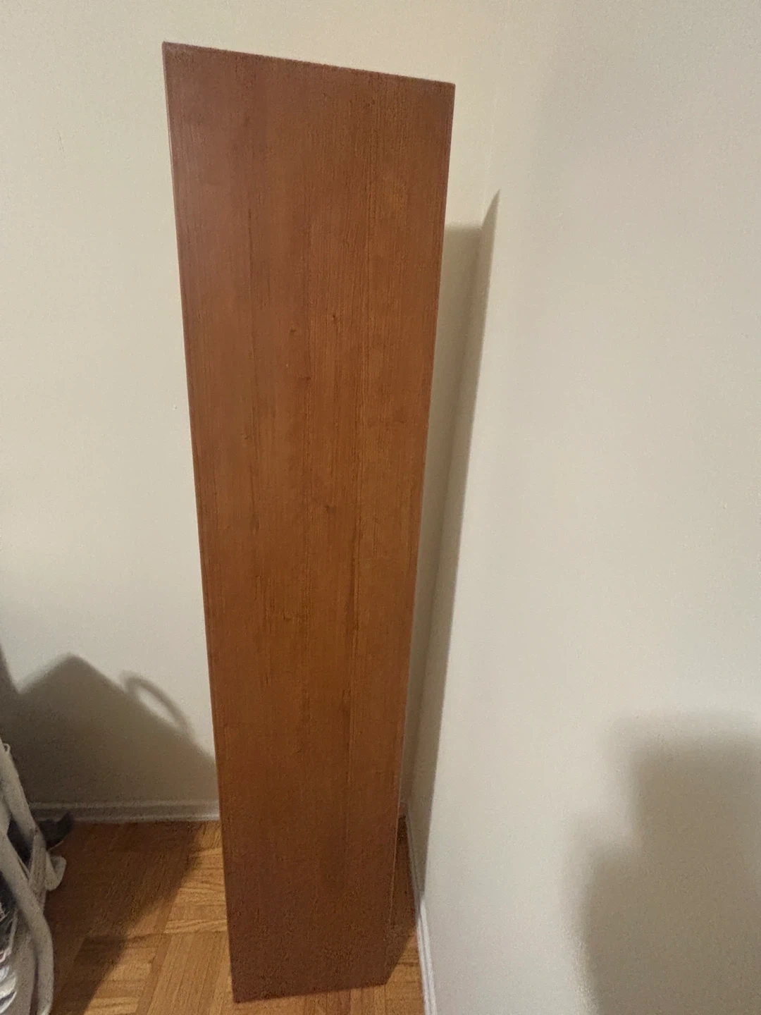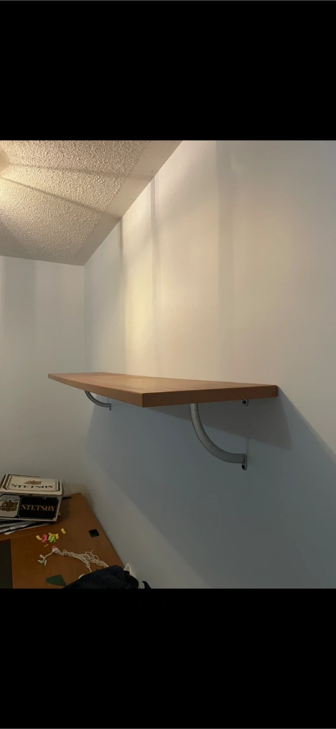 Selling a simple wooden wall shelf, perfect for adding some extra storage or display space to your home. It comes with the metal brackets for easy mounting. The shelf has a nice wood grain finish.