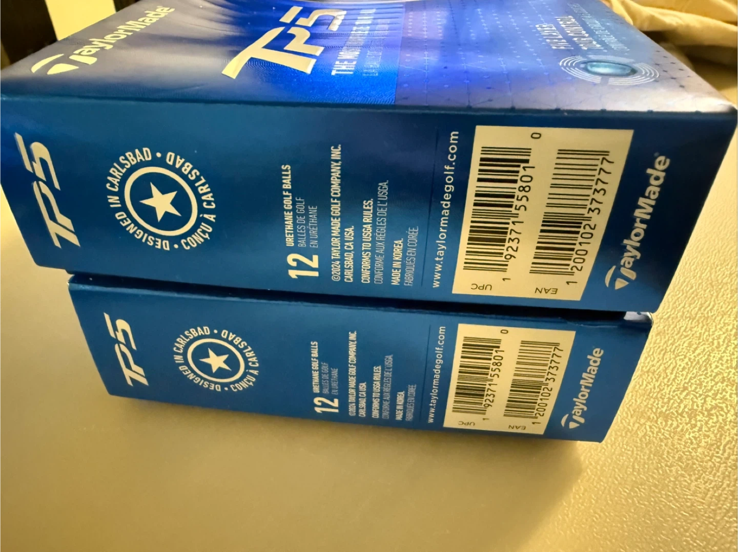 Two boxes of TaylorMade TP5 golf balls. Each box contains 12 urethane golf balls. These are five-layer tour balls with tour control.