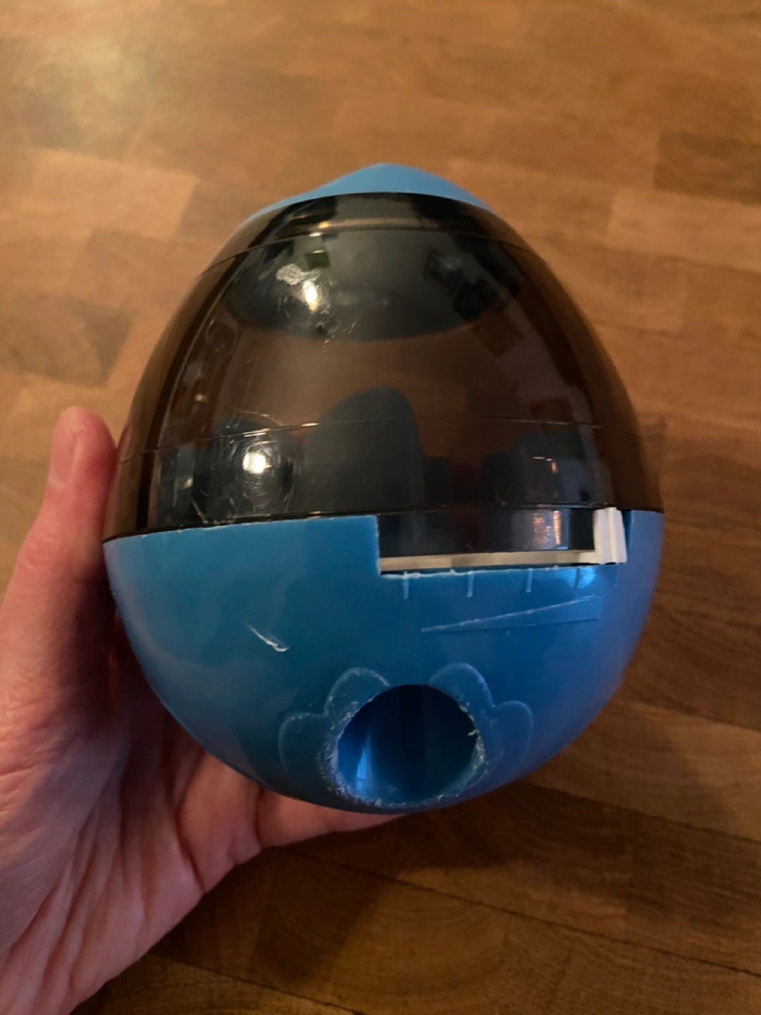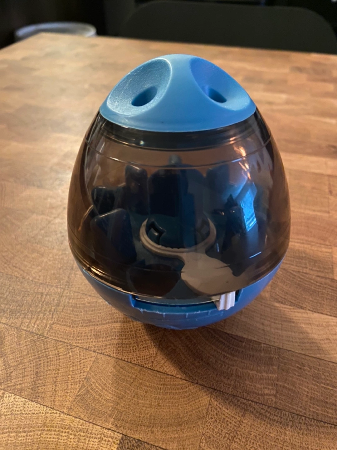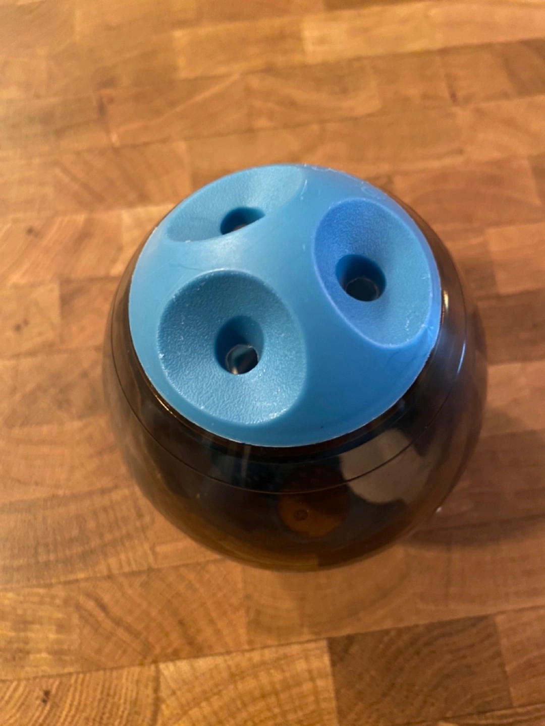 Blue and black plastic dog puzzle toy. Treats can be placed in the toy and the dog must roll the toy to get them out. Has multiple openings for the treats to fall out of. Good condition.