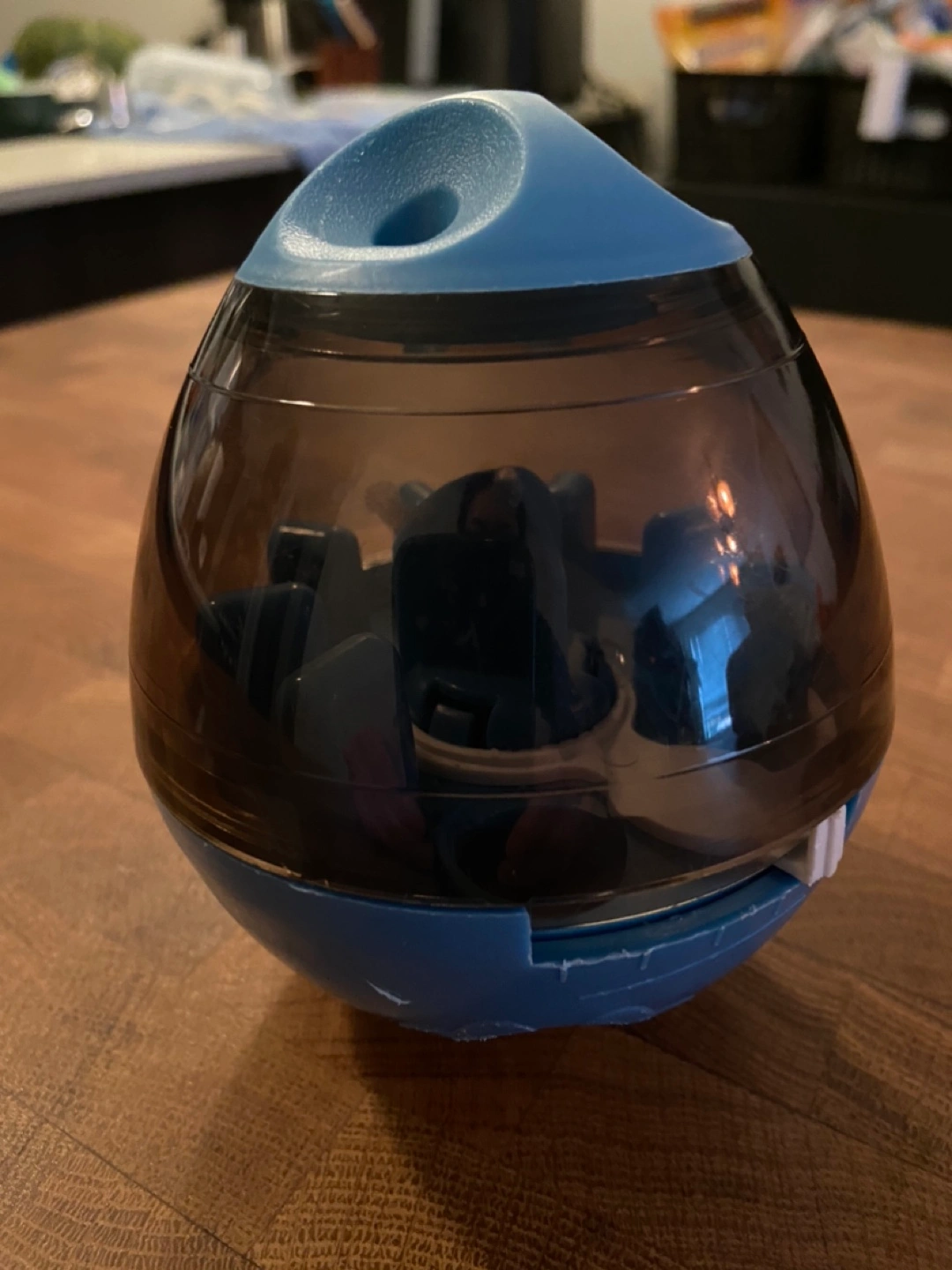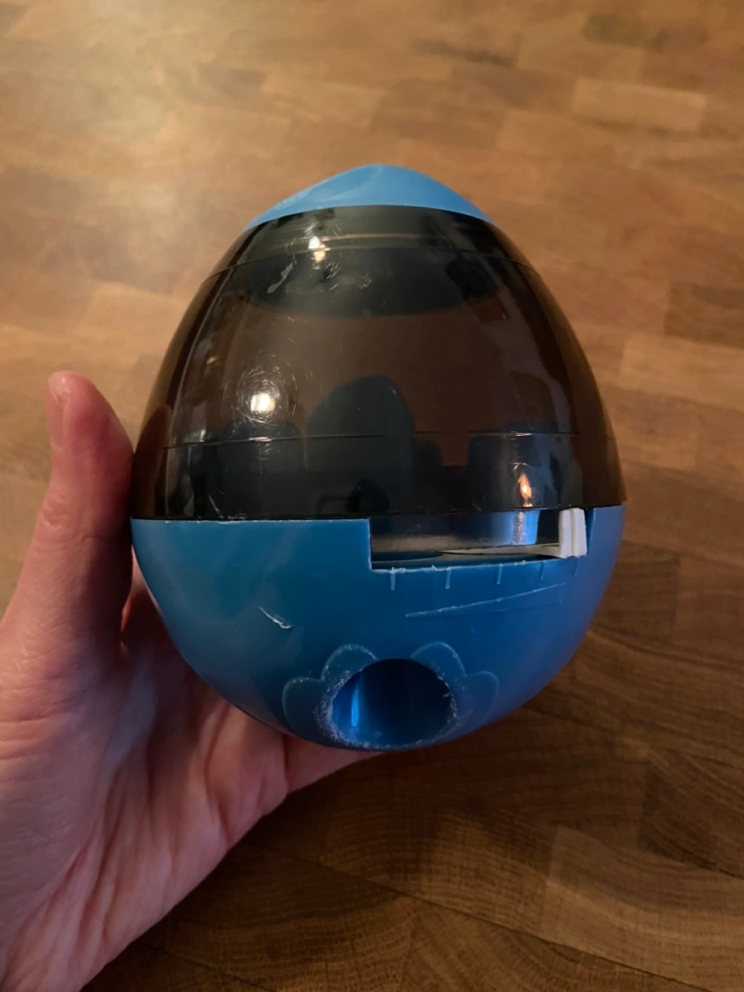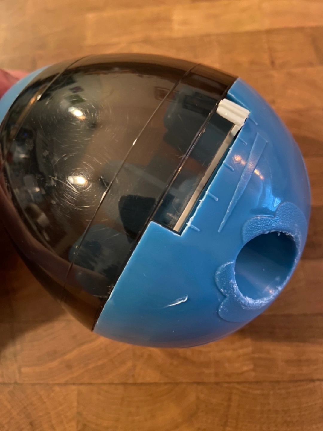 Blue and black plastic dog puzzle toy. Treats can be placed in the toy and the dog must roll the toy to get them out. Has multiple openings for the treats to fall out of. Good condition.