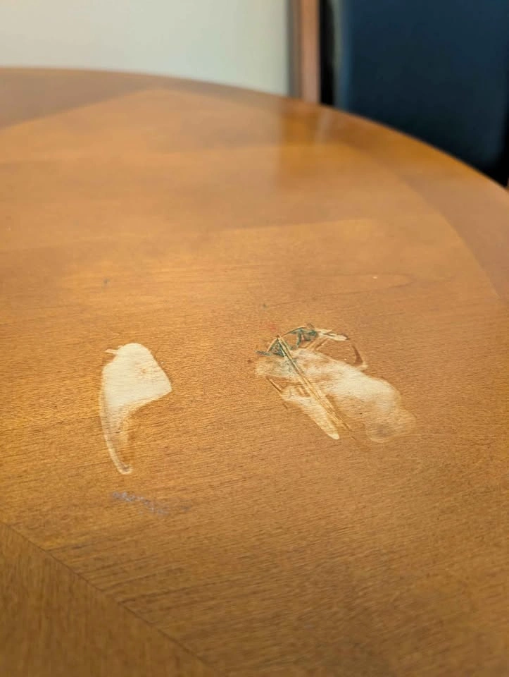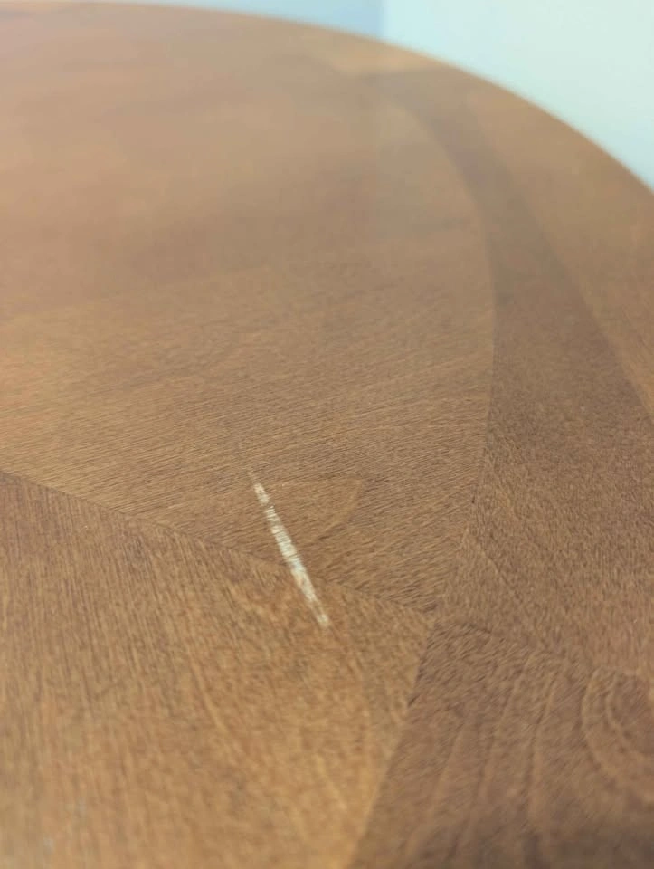 There is a stain and minor chips on the table surface (see photos). Other than that, it's in good shape. This will work for you if you use a table cloth.