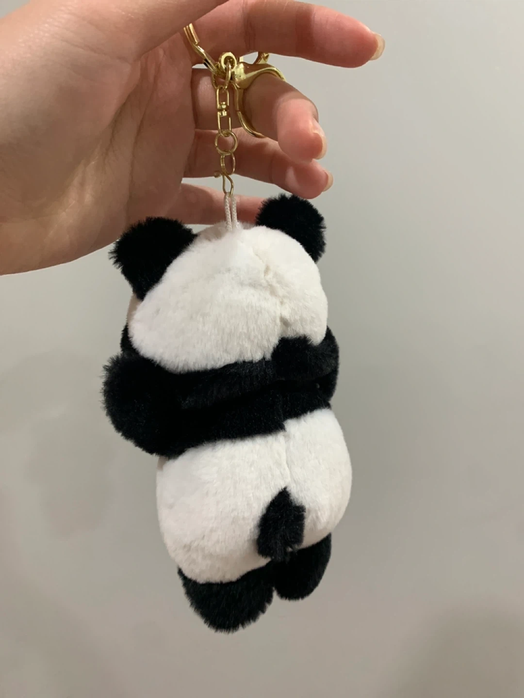 This is a super cute panda plush keychain toy! It's made of soft, fluffy material and features a little character peeking out from its panda hood. It's got a gold-tone clasp and ring for attaching to bags or keys. What a fun little accessory!
