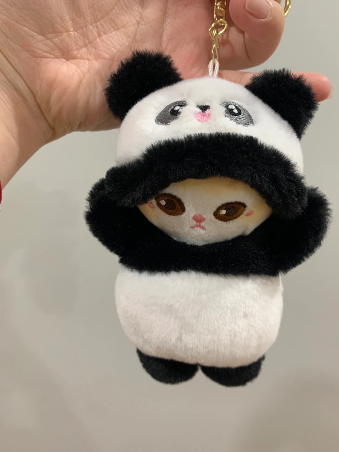 This is a super cute panda plush keychain toy! It's made of soft, fluffy material and features a little character peeking out from its panda hood. It's got a gold-tone clasp and ring for attaching to bags or keys. What a fun little accessory!