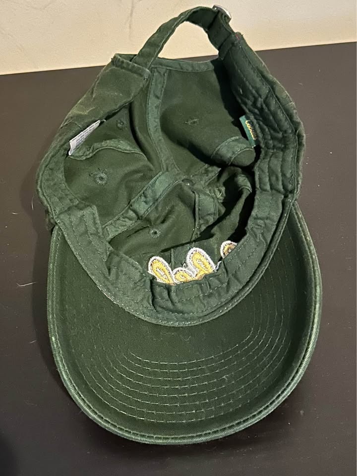A classic, unstructured strapback or trucker-style hat with a solid green pattern, often constructed from 100% cotton twill. Typically includes an adjustable strapback closure, making it a one-size-fits-all (OSFA) accessory. Frequently described as a vintage-style hunting or fishing outdoors cap. Hat has been cleaned and sanitized. Hat is adjustable so one size fits all.