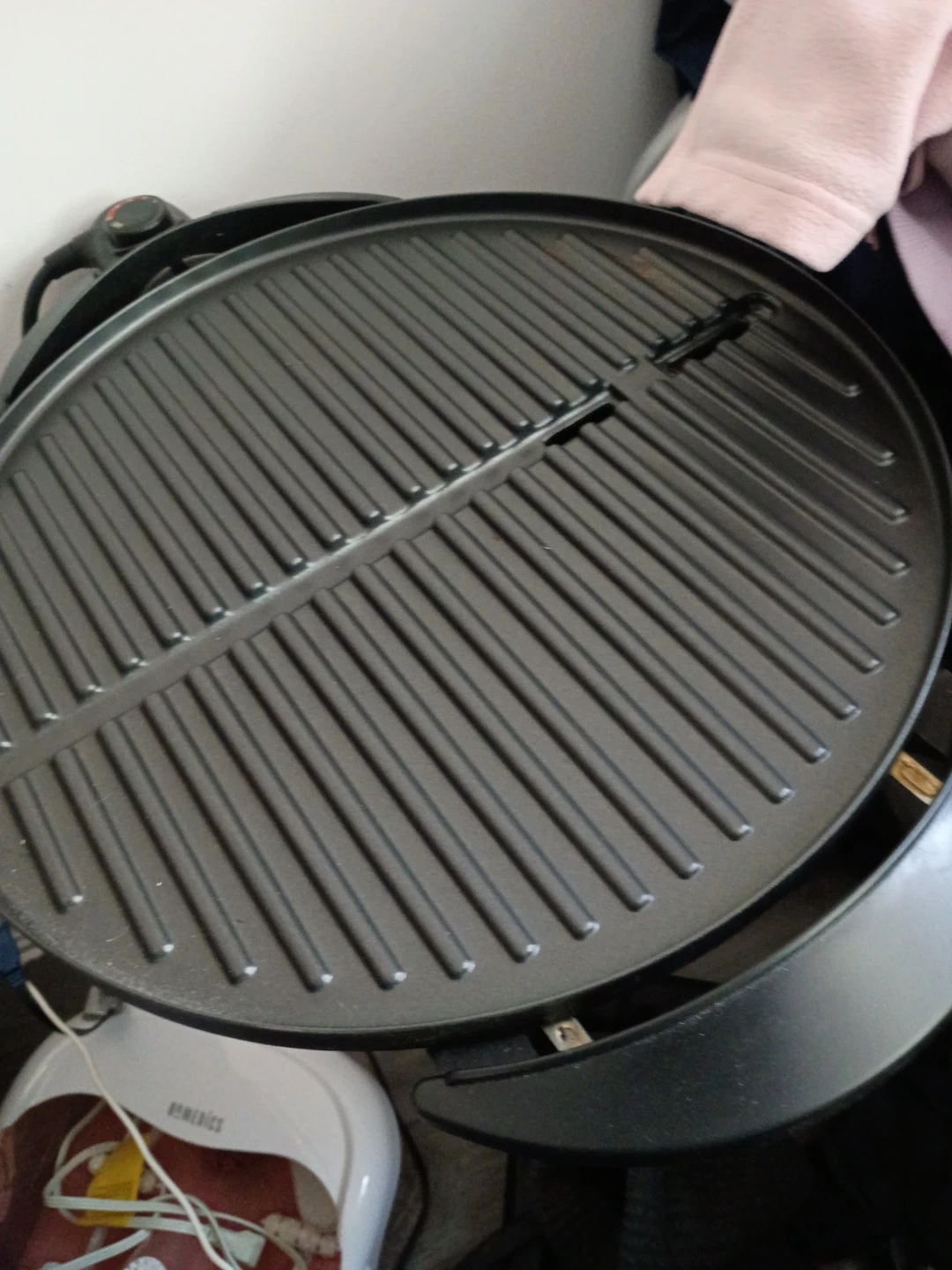 This is a George Foreman indoor/outdoor electric grill. It has a round grilling surface with non-stick coating. The grill is black and comes with a lid.