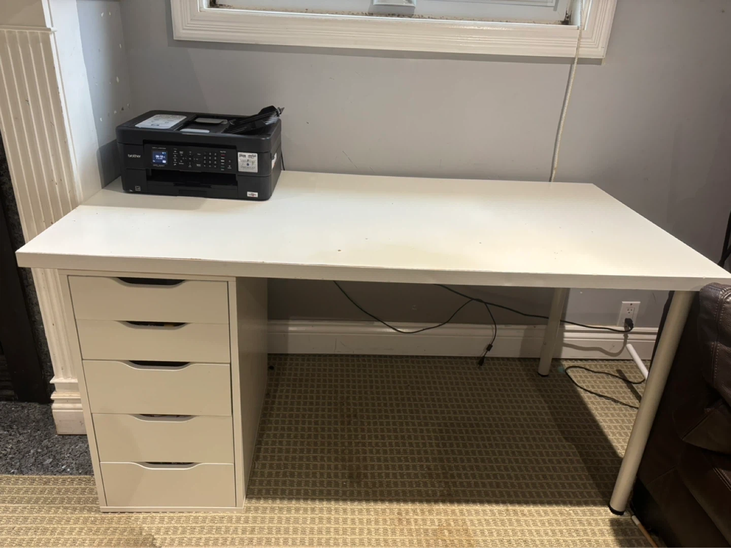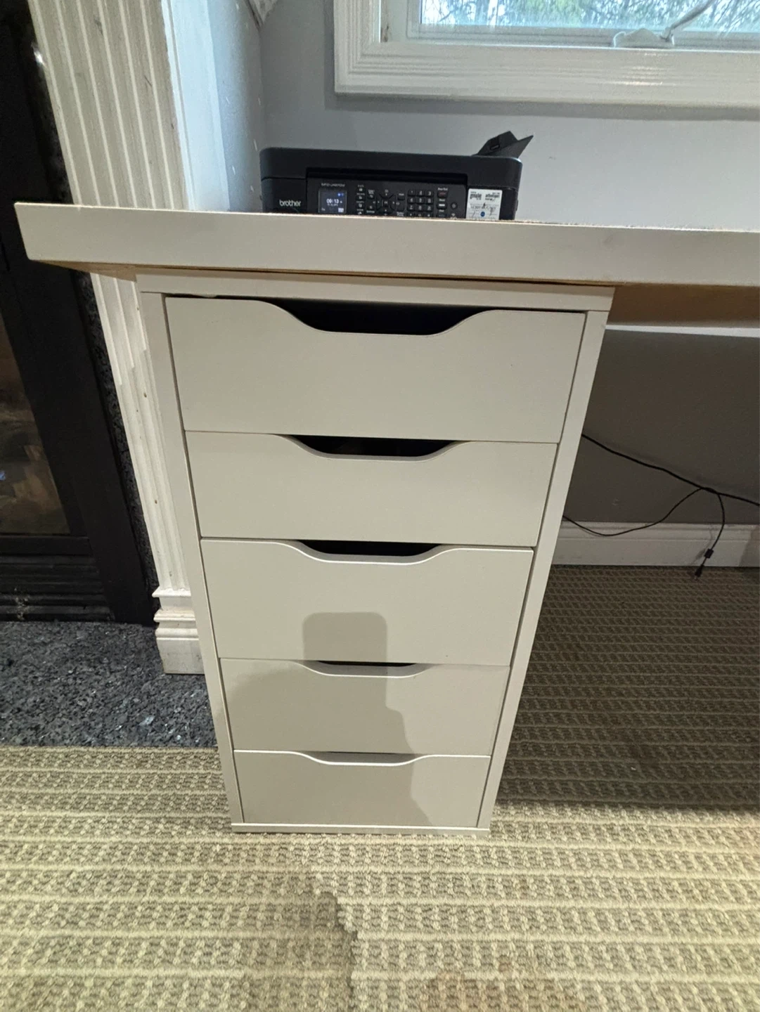 White desk with a five-drawer unit