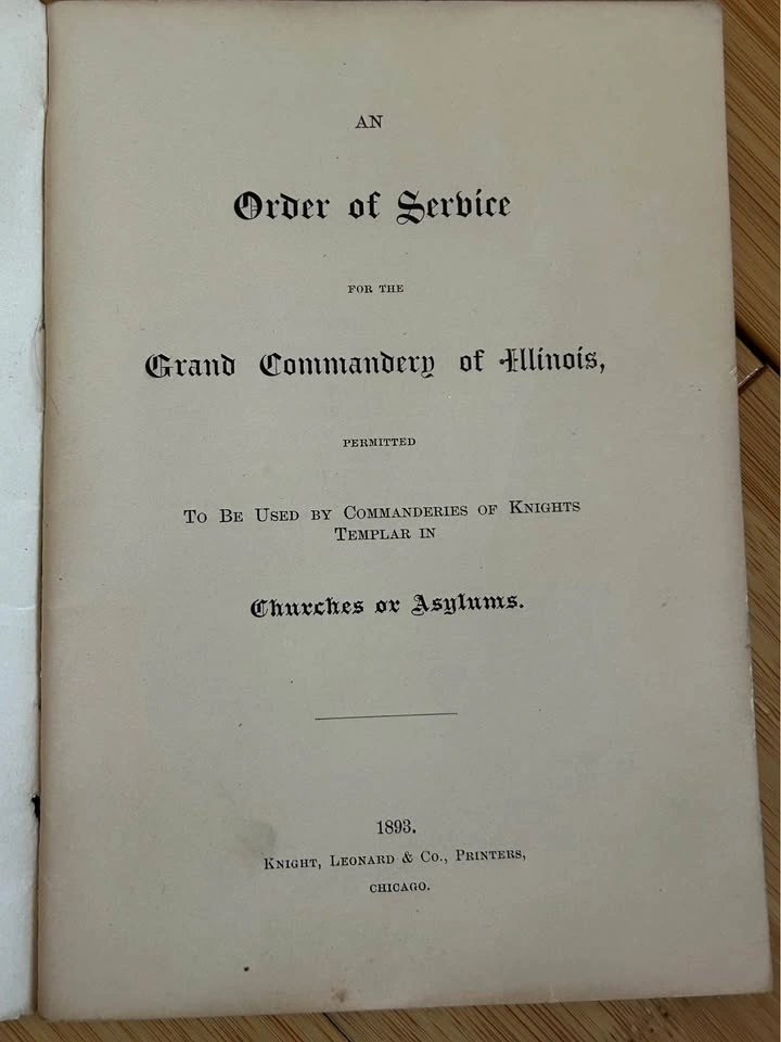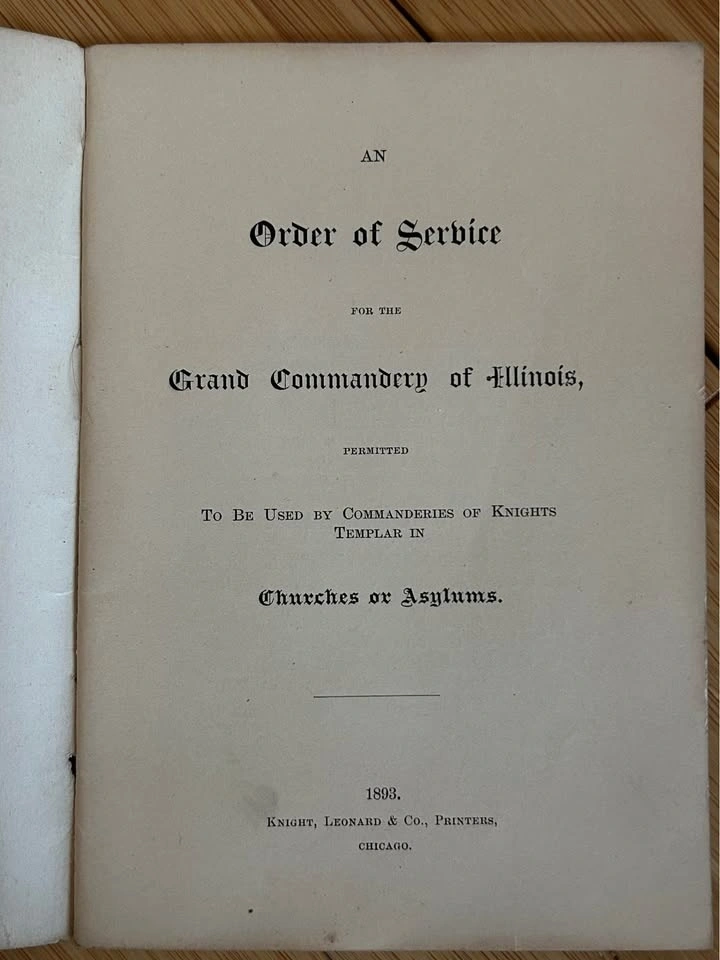 This item is an Order of Service booklet published in 1893 for the Grand Commandery of Illinois, which is the governing body for the Knights Templar in the state of Illinois.