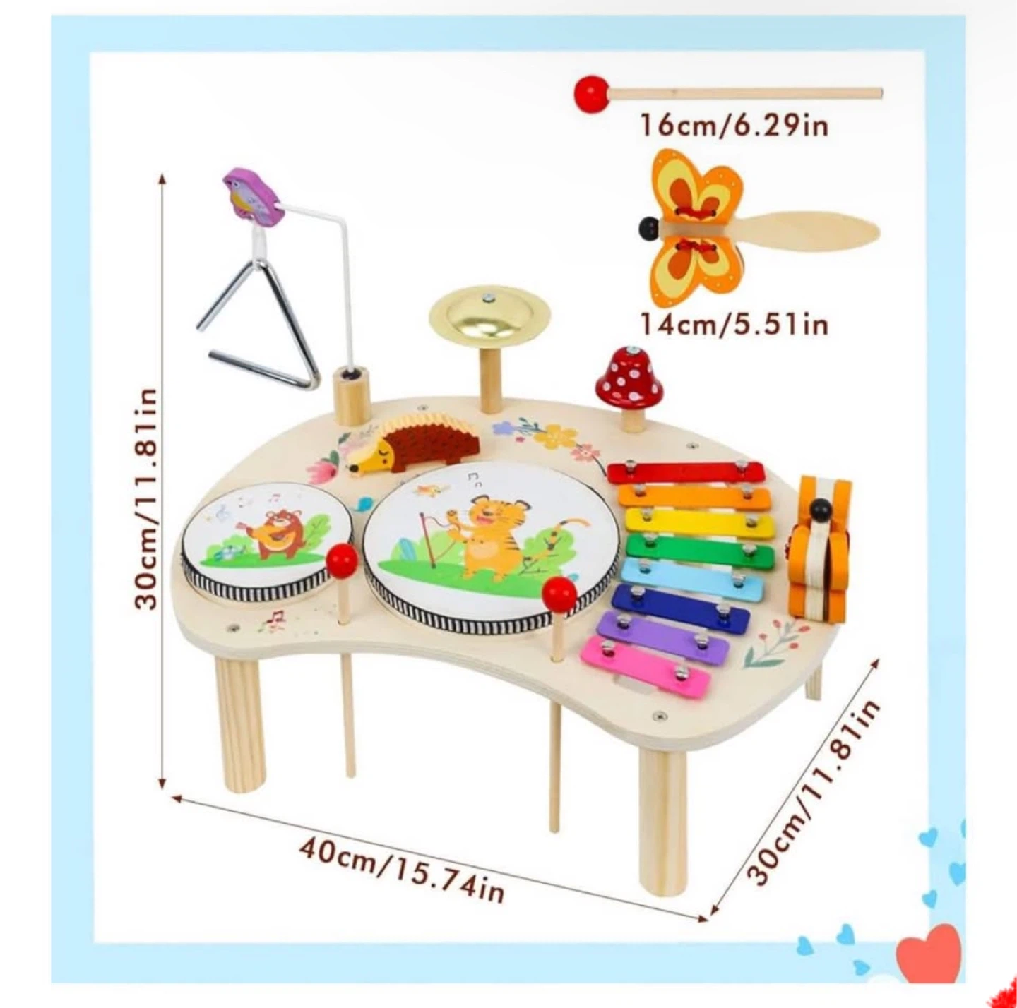 This wooden musical instrument set includes drums, a xylophone, and a triangle. The table measures 40cm/15.74in long and 30cm/11.81in high. It's great for little ones to explore rhythm and sound!