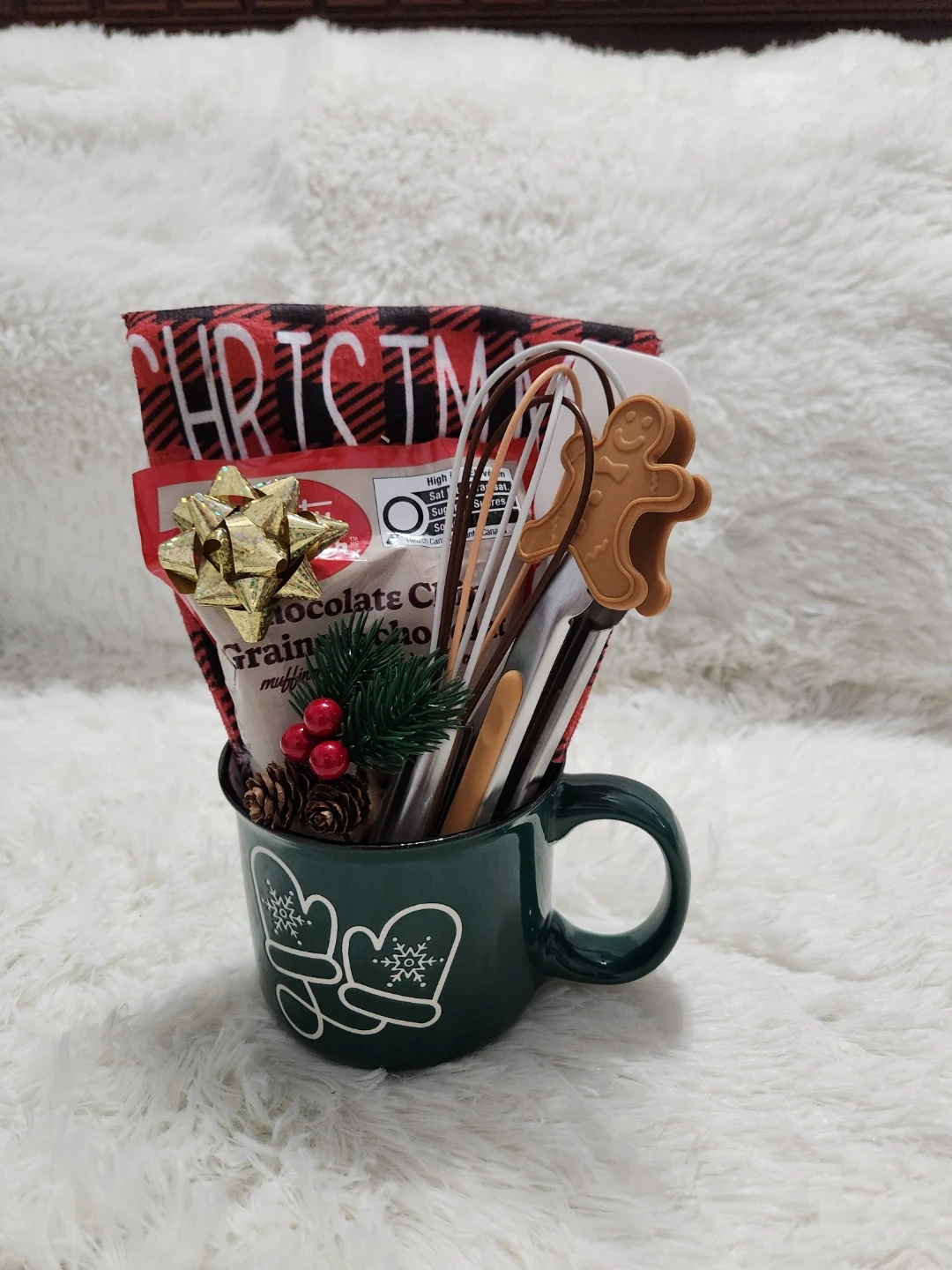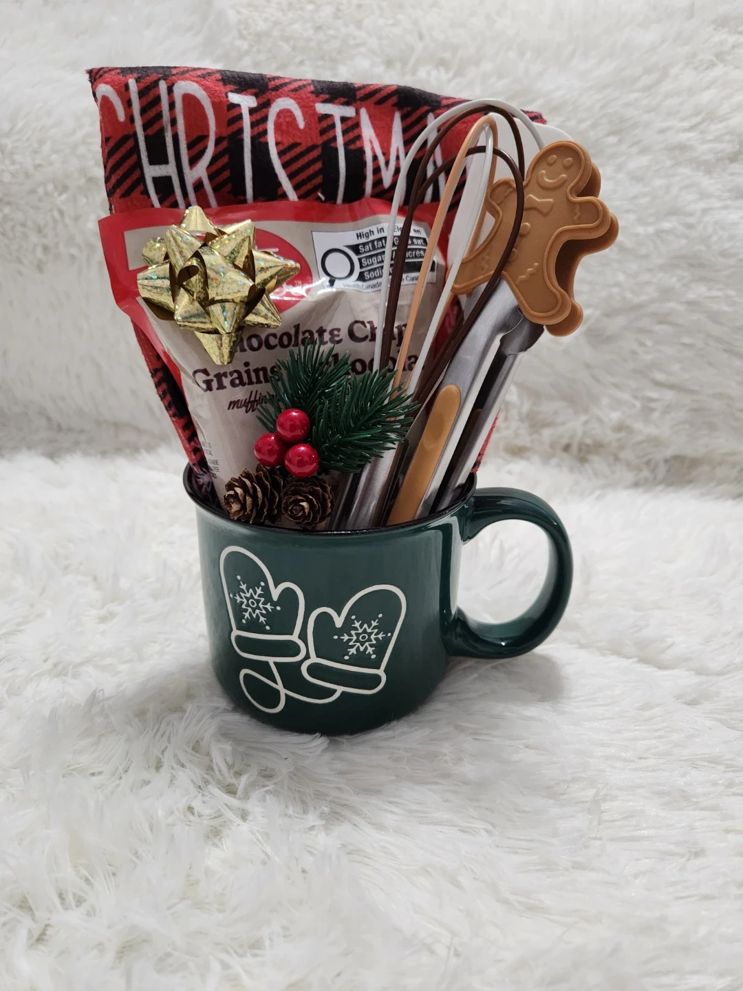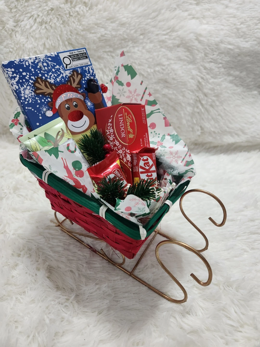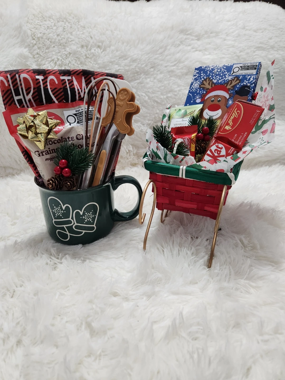One is a cute mug filled with baking supplies and a festive towel. The other is a sleigh overflowing with chocolates and treats! Perfect for spreading some holiday cheer for your kids teachers or staff.