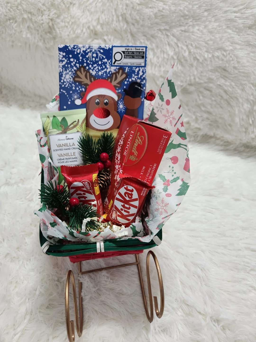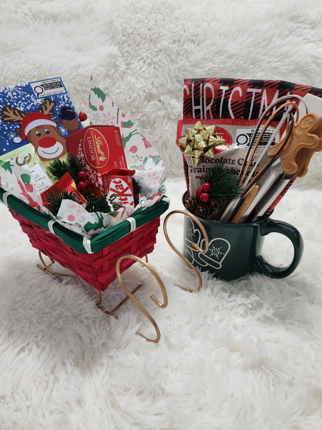 One is a cute mug filled with baking supplies and a festive towel. The other is a sleigh overflowing with chocolates and treats! Perfect for spreading some holiday cheer for your kids teachers or staff.