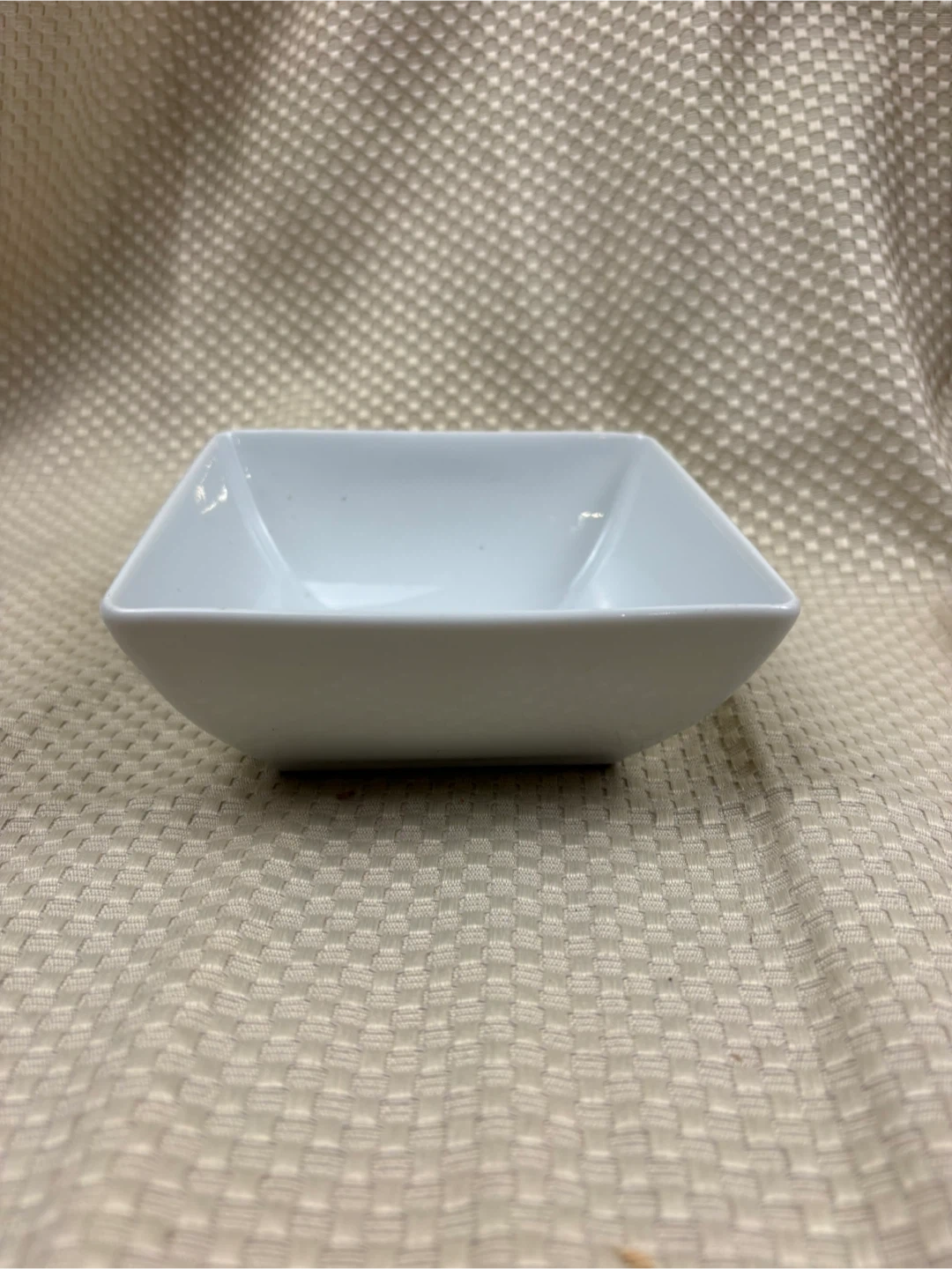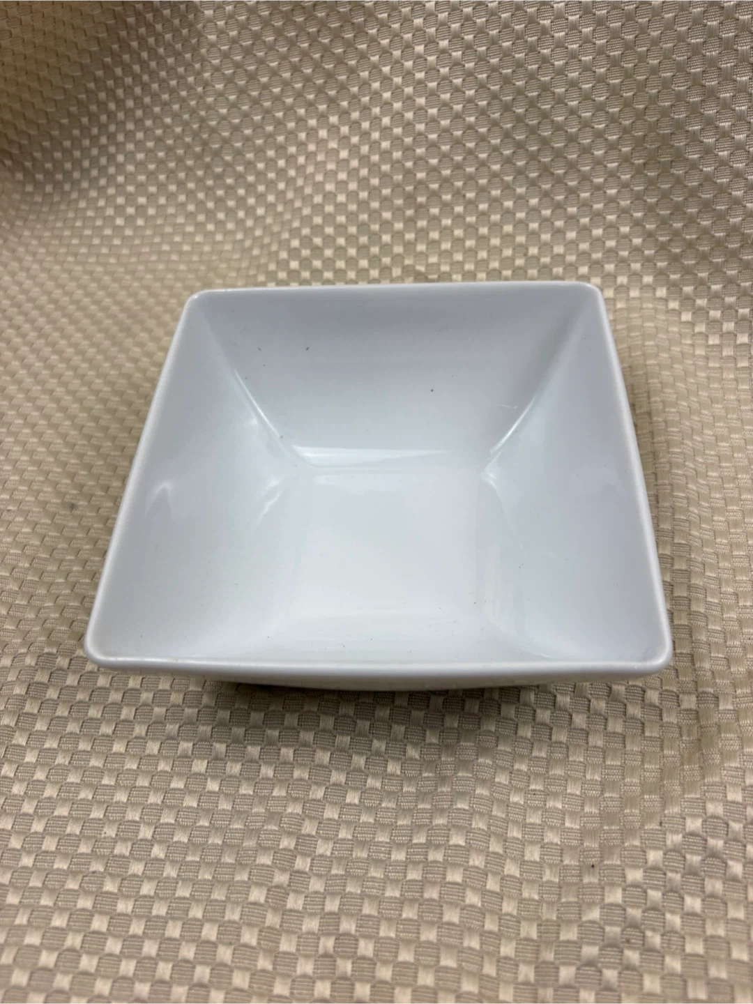 This is a Japanske Porcelaine square bowl. It's made of porcelain and was made in France. This bowl is white and has a unique square shape. It's a nice dish for serving snacks or small portions.