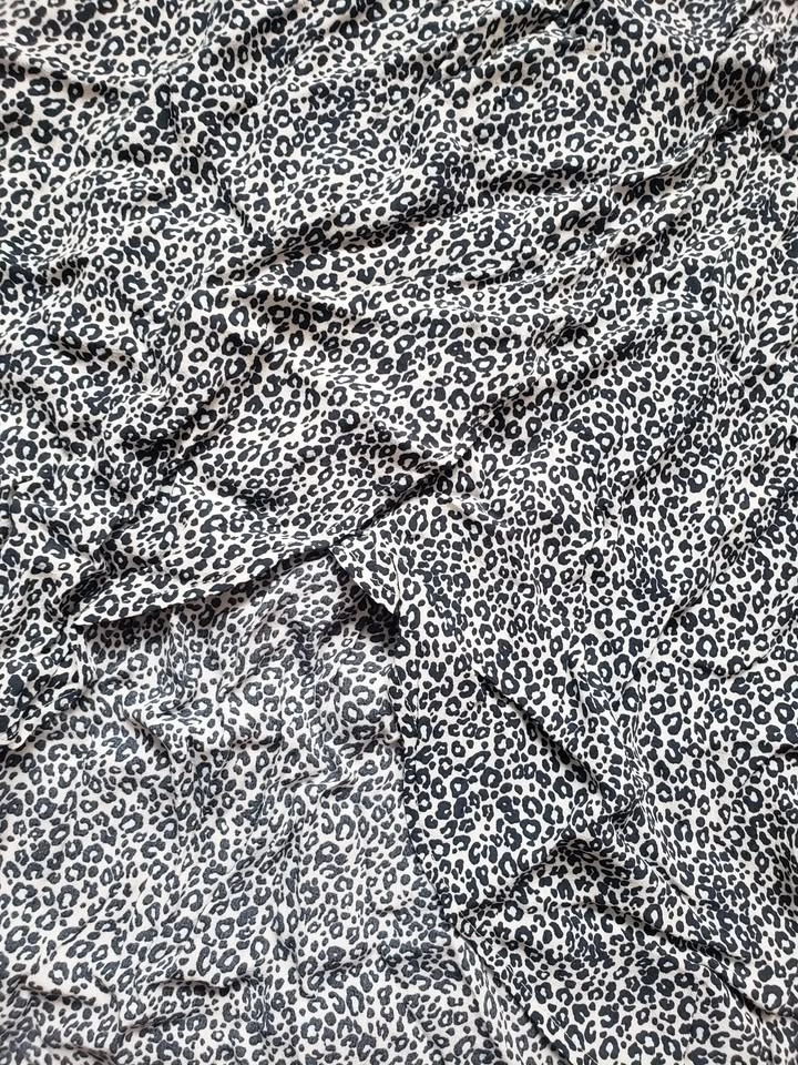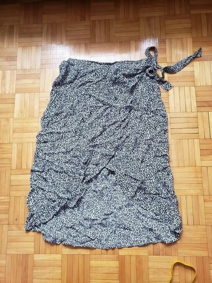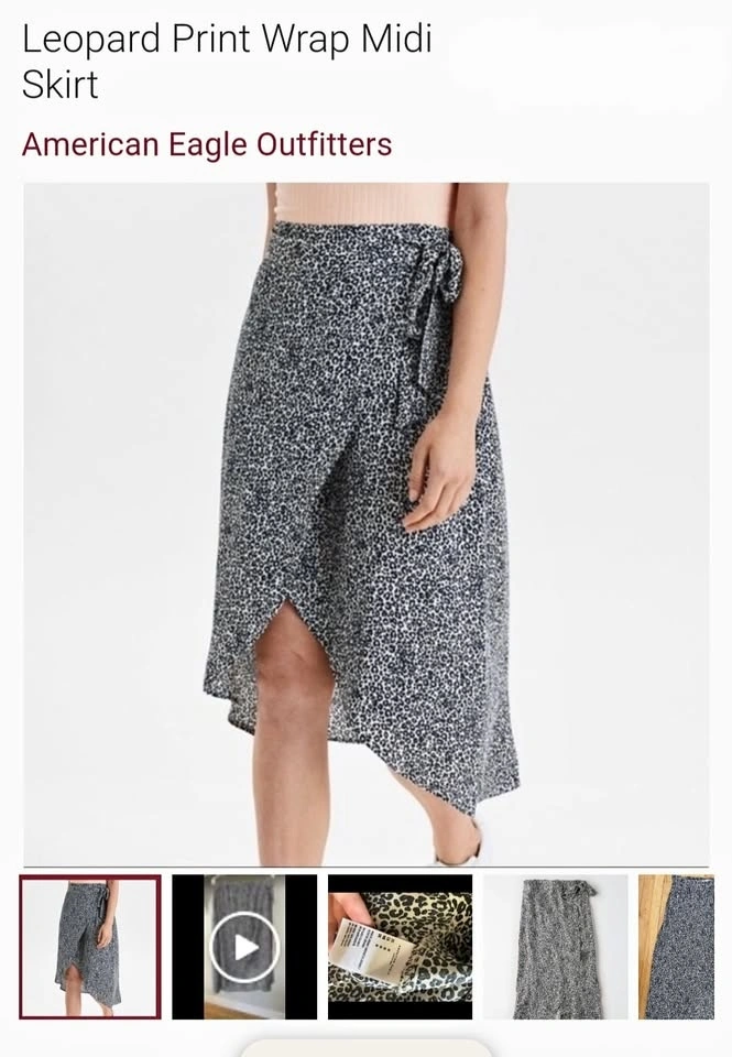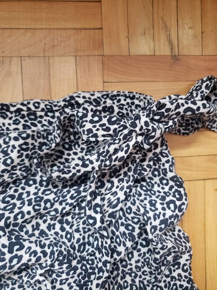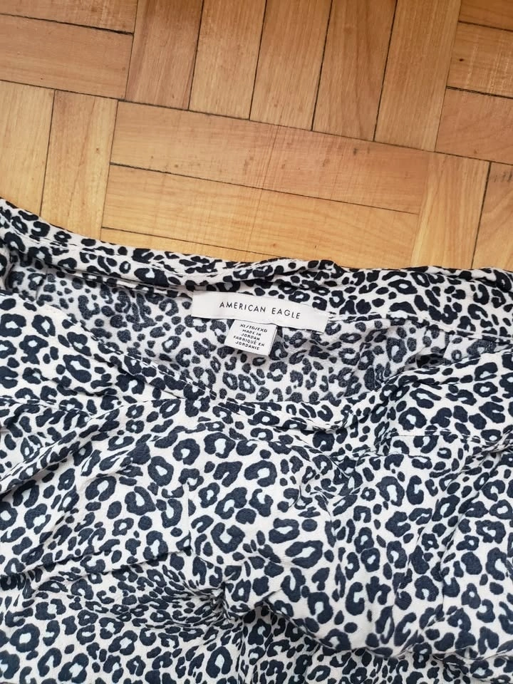 American Eagle XL leopard print wrap skirt. Asymmetrical due to the wrap. Grey and cream with hints of blue in leopard spots. Button and tie closure. 18" waist, 35" length. Worn a couple times (wrinkled from storage). Pick up at Queen and John.