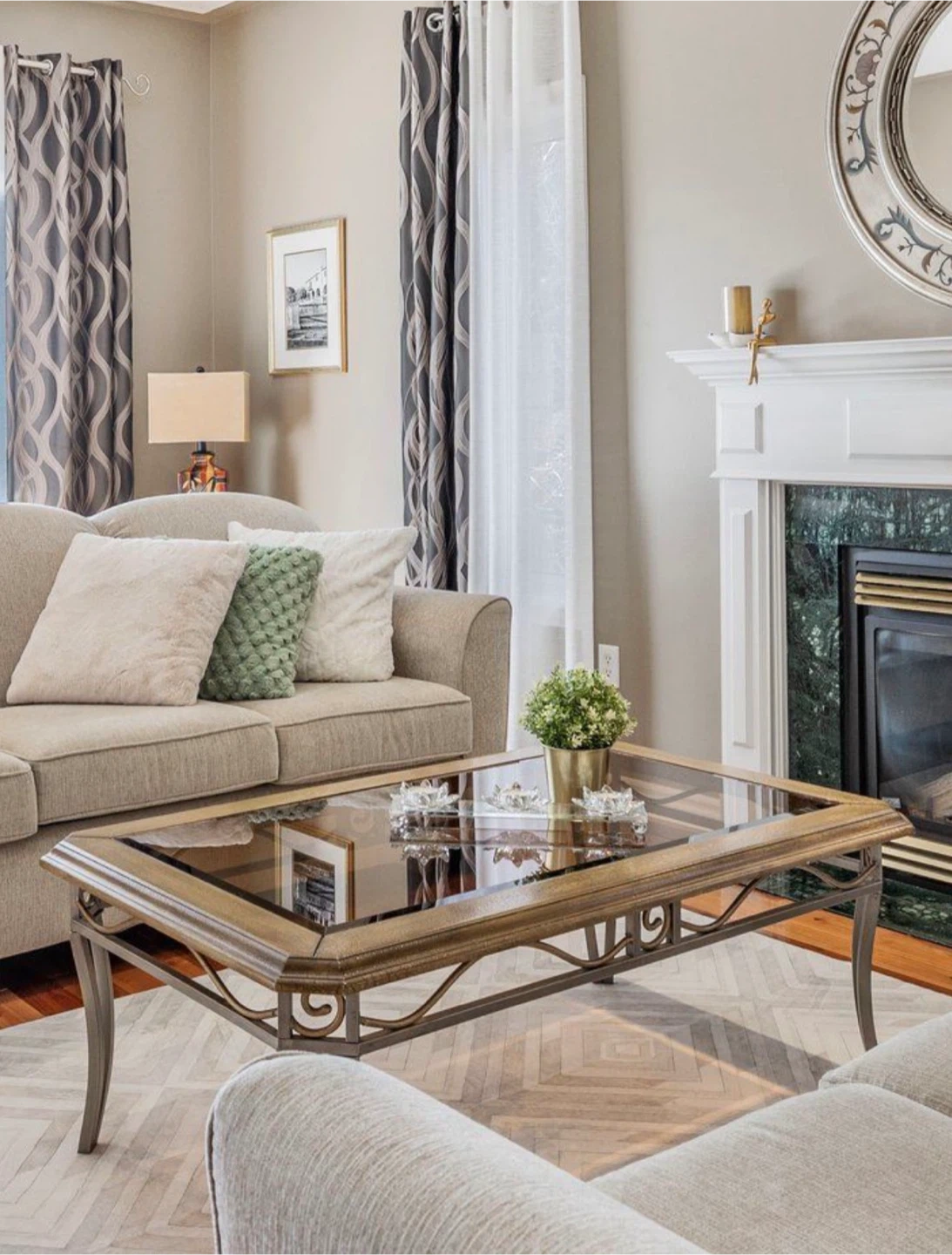 This coffee table features a mirrored glass top with an ornate metal frame in a bronze finish. Its unique scrollwork legs add a touch of elegance to any living space. It's a substantial piece, perfect for holding drinks and decor.
