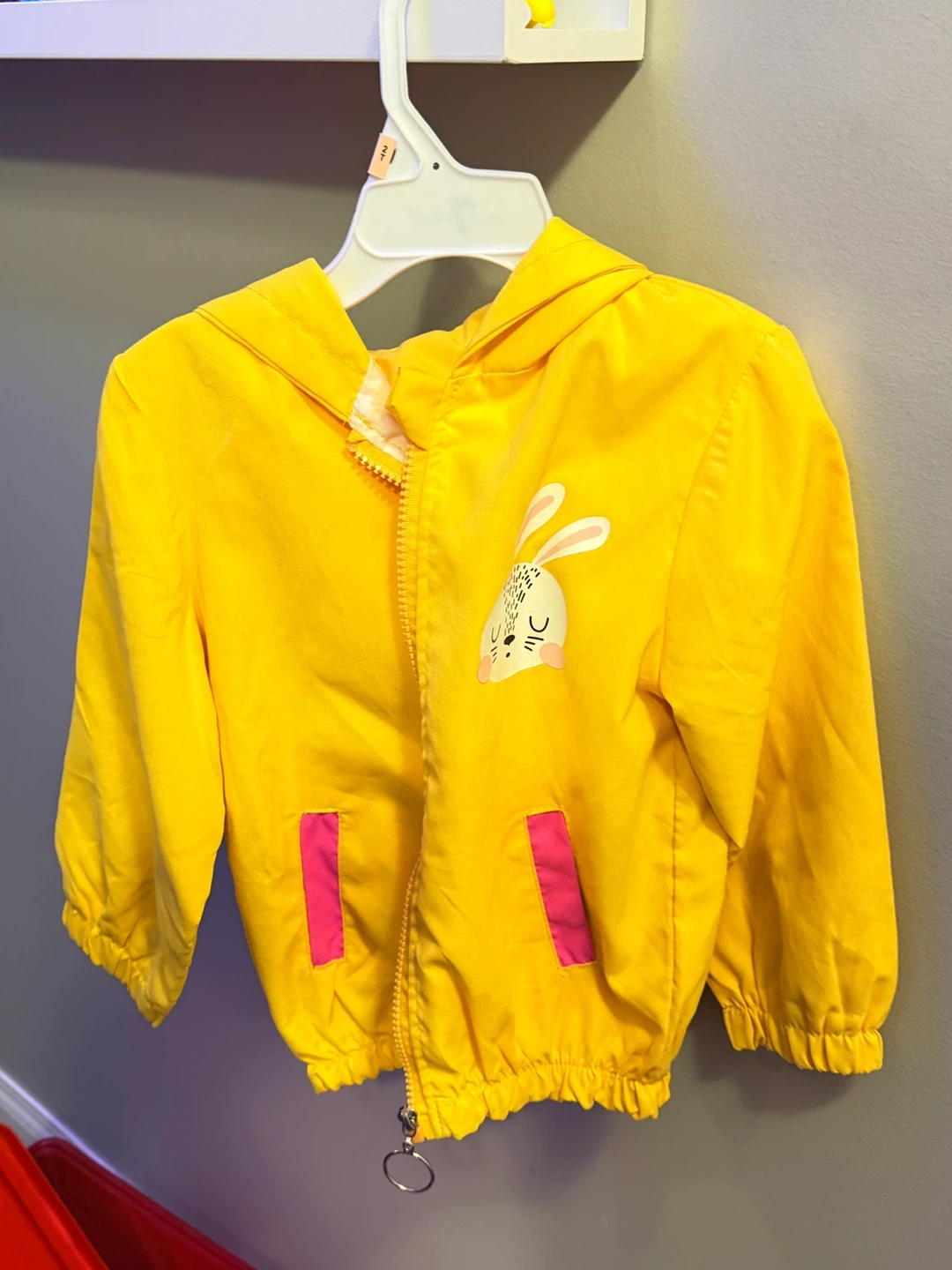 A cute yellow rain jacket for kids! It features a sweet bunny design and pink pocket details. Perfect for keeping your little one dry and stylish on rainy days