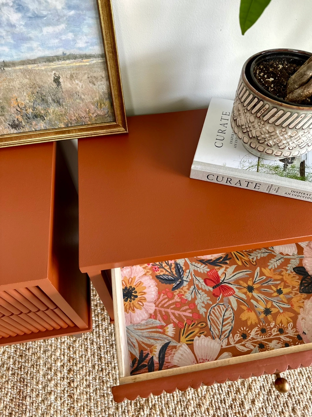 The legs have been stripped and re-stained in a warm medium walnut. Rounded fluting was added to the drawer fronts for a subtle, custom texture, and each piece was primed, painted. Antique bronze knobs and vintage floral drawer liners complete the look with refined, thoughtful details.