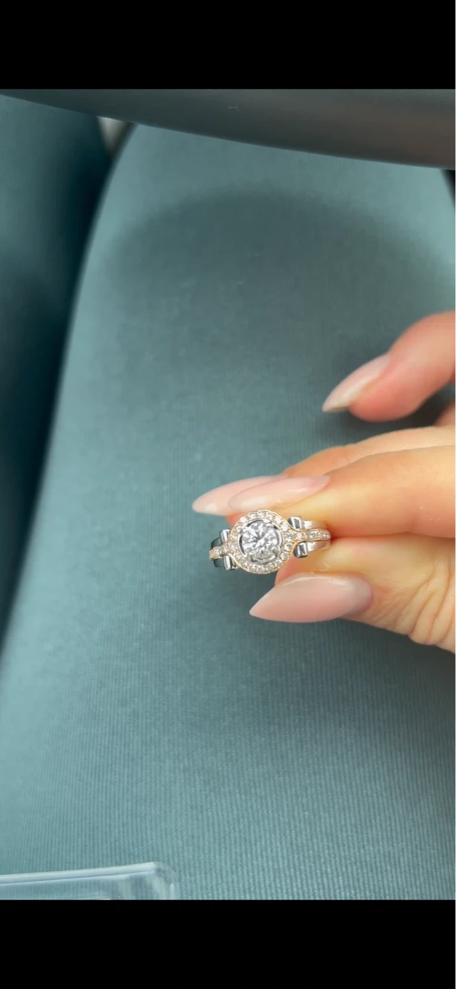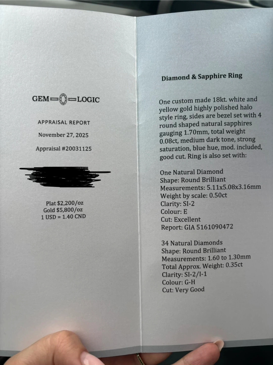 One custom made 18kt white and yellow gold ring with a halo of round natural sapphires and a central round brilliant diamond. The ring also features 34 natural diamonds on the band. This appraisal report is included.