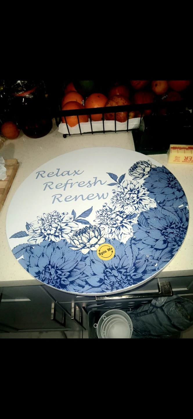 Round decorative platter with a blue and white floral design. It features the text 'Relax Refresh Renew'. Perfect for adding a touch of style to your home decor. Great for serving or display!