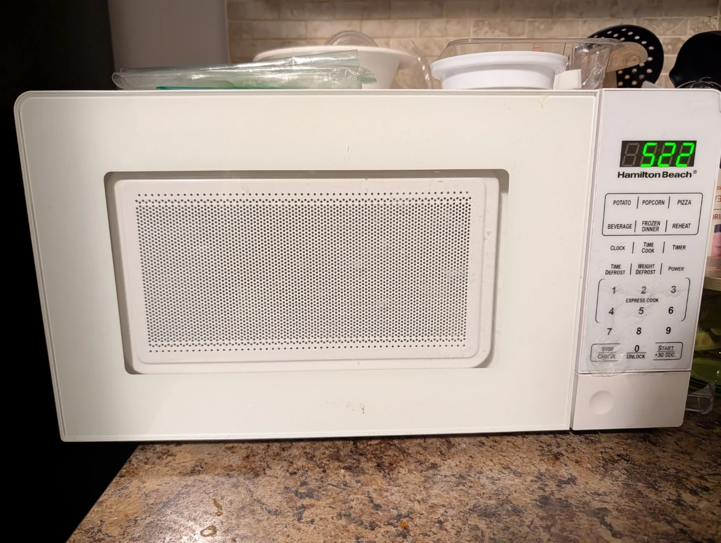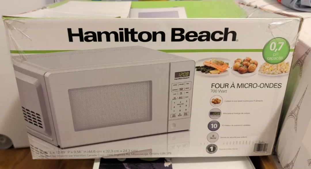 White Hamilton Beach microwave with 700 Watt power. It's a compact size with preset cooking options. Comes with a glass turntable.