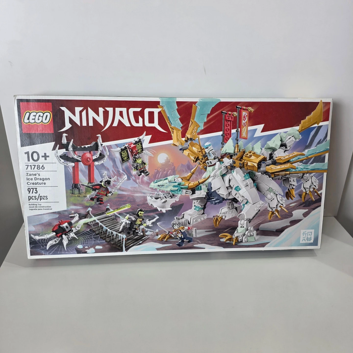 This LEGO Ninjago set is Zane's Ice Dragon Creature, model 71786. It has 973 pieces and is recommended for ages 10+. This set builds a dragon and a warrior.