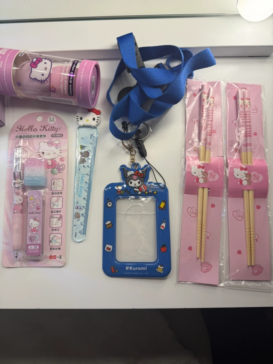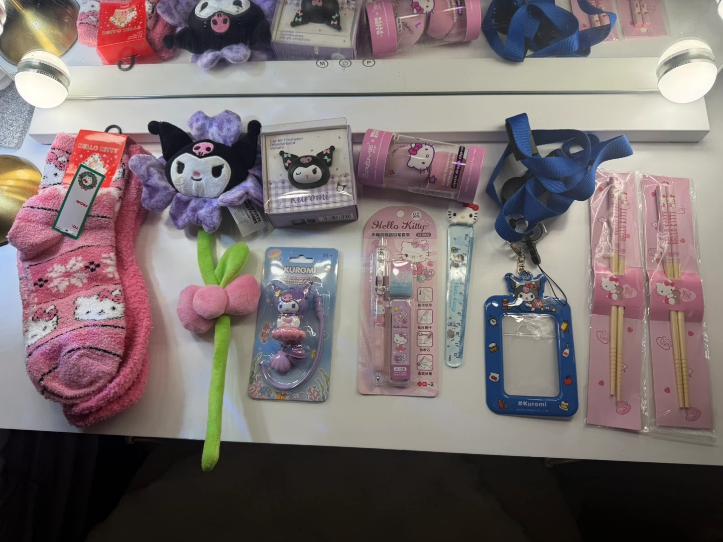A fun collection featuring Hello Kitty and Kuromi items, including a pen and eraser set, chopsticks, a ruler, and a Kuromi car air freshener. This bundle also has fuzzy pink socks with a Hello Kitty design. Perfect for fans of these popular Sanrio characters!