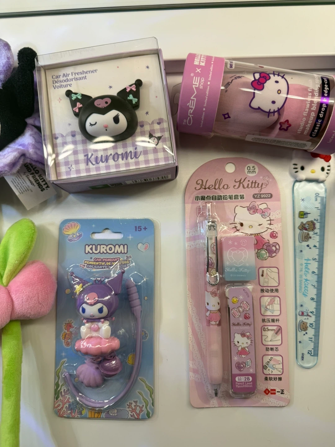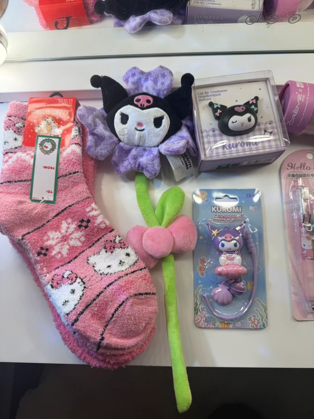 A fun collection featuring Hello Kitty and Kuromi items, including a pen and eraser set, chopsticks, a ruler, and a Kuromi car air freshener. This bundle also has fuzzy pink socks with a Hello Kitty design. Perfect for fans of these popular Sanrio characters!