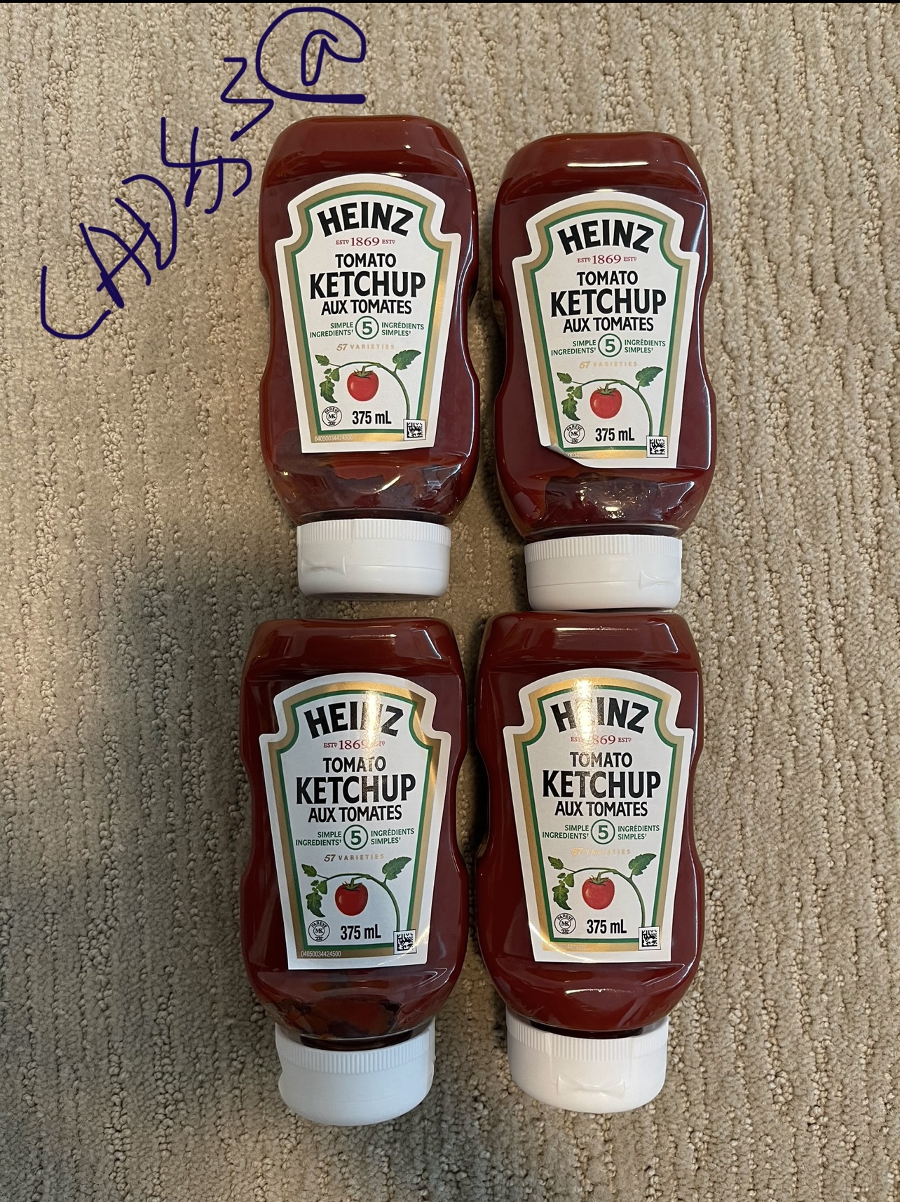 Selling four bottles of Heinz Tomato Ketchup. Each bottle contains 375 mL of delicious ketchup made with simple ingredients. Perfect for fries, burgers, or whatever you like!