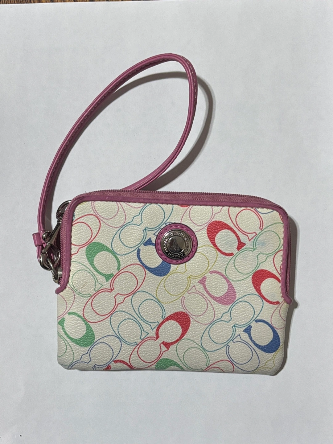 This is a Coach wristlet with a colourful signature 'C' pattern. It's made of coated canvas with leather trim. Inside, it has card slots and a zippered pocket. Outside has a slot on the back as well. Slightly dirty inside as pictured.