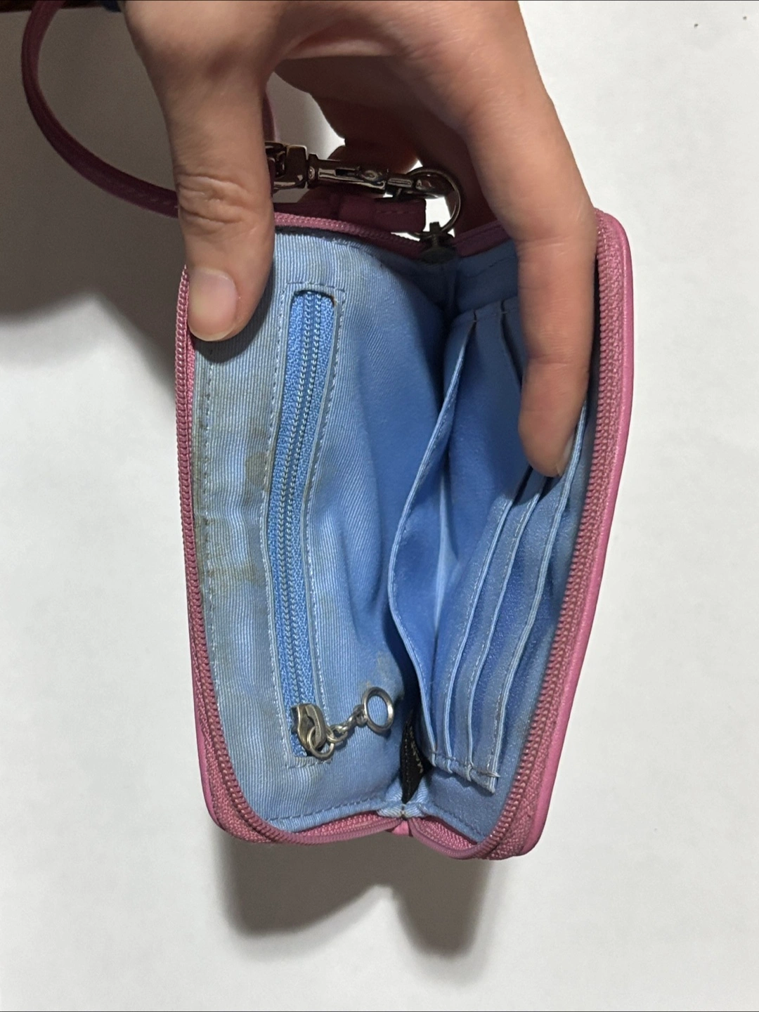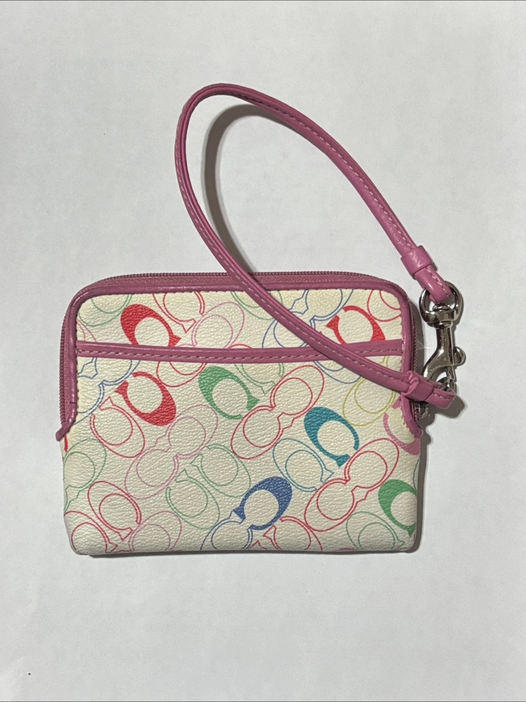 This is a Coach wristlet with a colourful signature 'C' pattern. It's made of coated canvas with leather trim. Inside, it has card slots and a zippered pocket. Outside has a slot on the back as well. Slightly dirty inside as pictured.