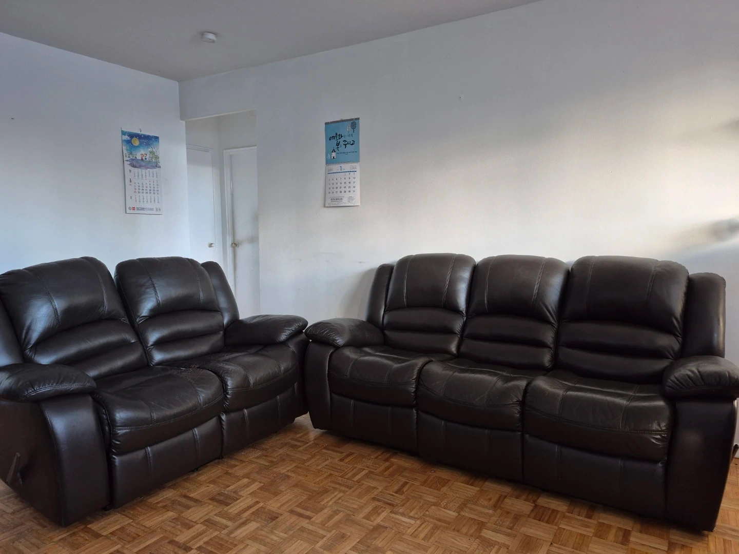 This is a three-seater and two-seater reclining sofa upholstered in dark brown leather. That is pulling out sofa.It features plush cushioning and padded arms for comfort. The sofa is suitable for a living room or den.
