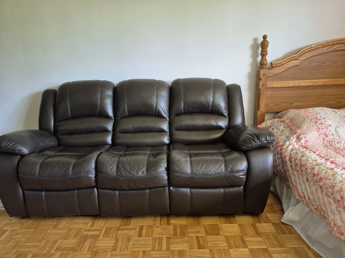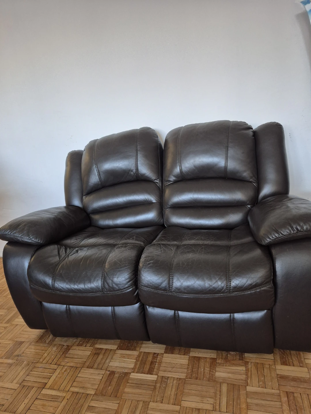 This is a three-seater and two-seater reclining sofa upholstered in dark brown leather. That is pulling out sofa.It features plush cushioning and padded arms for comfort. The sofa is suitable for a living room or den.