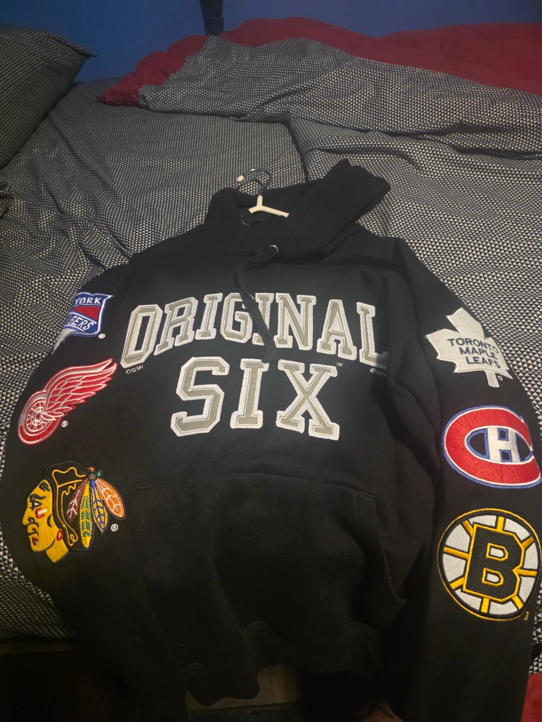 Black hoodie featuring the Original Six NHL teams. Includes logos for the New York Rangers, Detroit Red Wings, Chicago Blackhawks, Toronto Maple Leafs, Montreal Canadiens, and Boston Bruins. Made from a comfortable fabric blend.