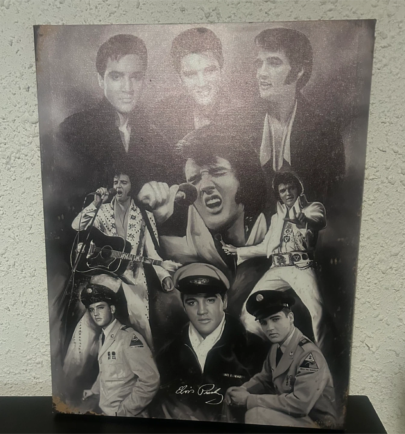 This wall art features a collage of iconic images of Elvis Presley. It showcases the legendary performer in various poses and outfits. It's a great piece for any Elvis fan's collection!