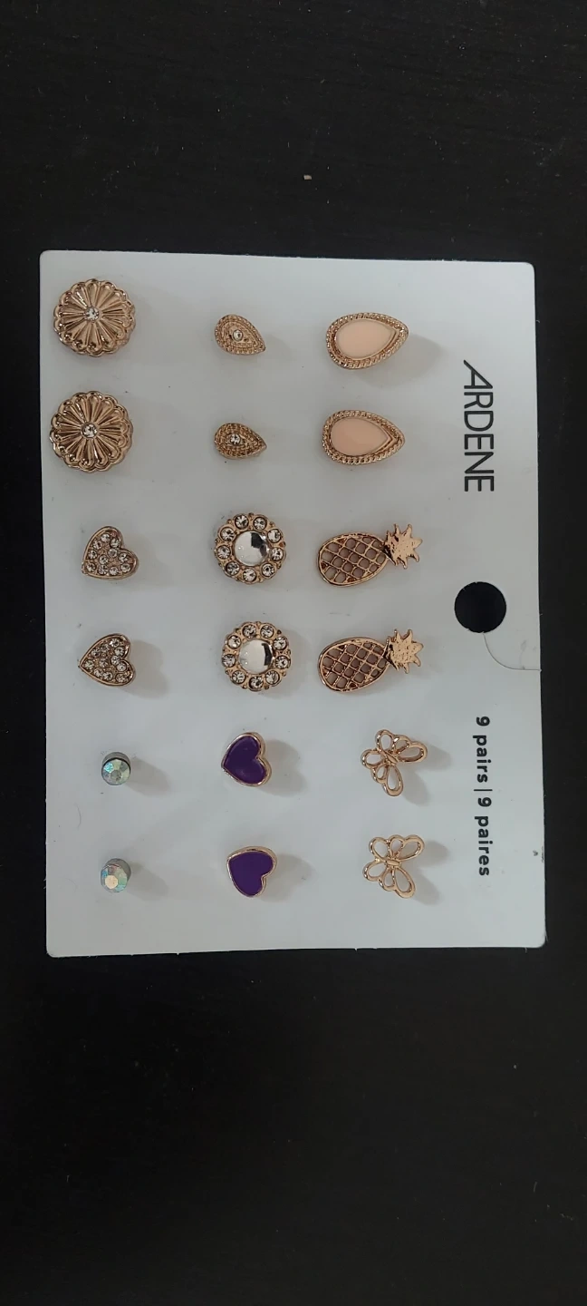 This Ardene earring set includes 9 pairs with various fun designs, including pineapples, hearts, and butterflies. They're made with a gold-tone finish. This set offers a good mix of styles for everyday wear.
