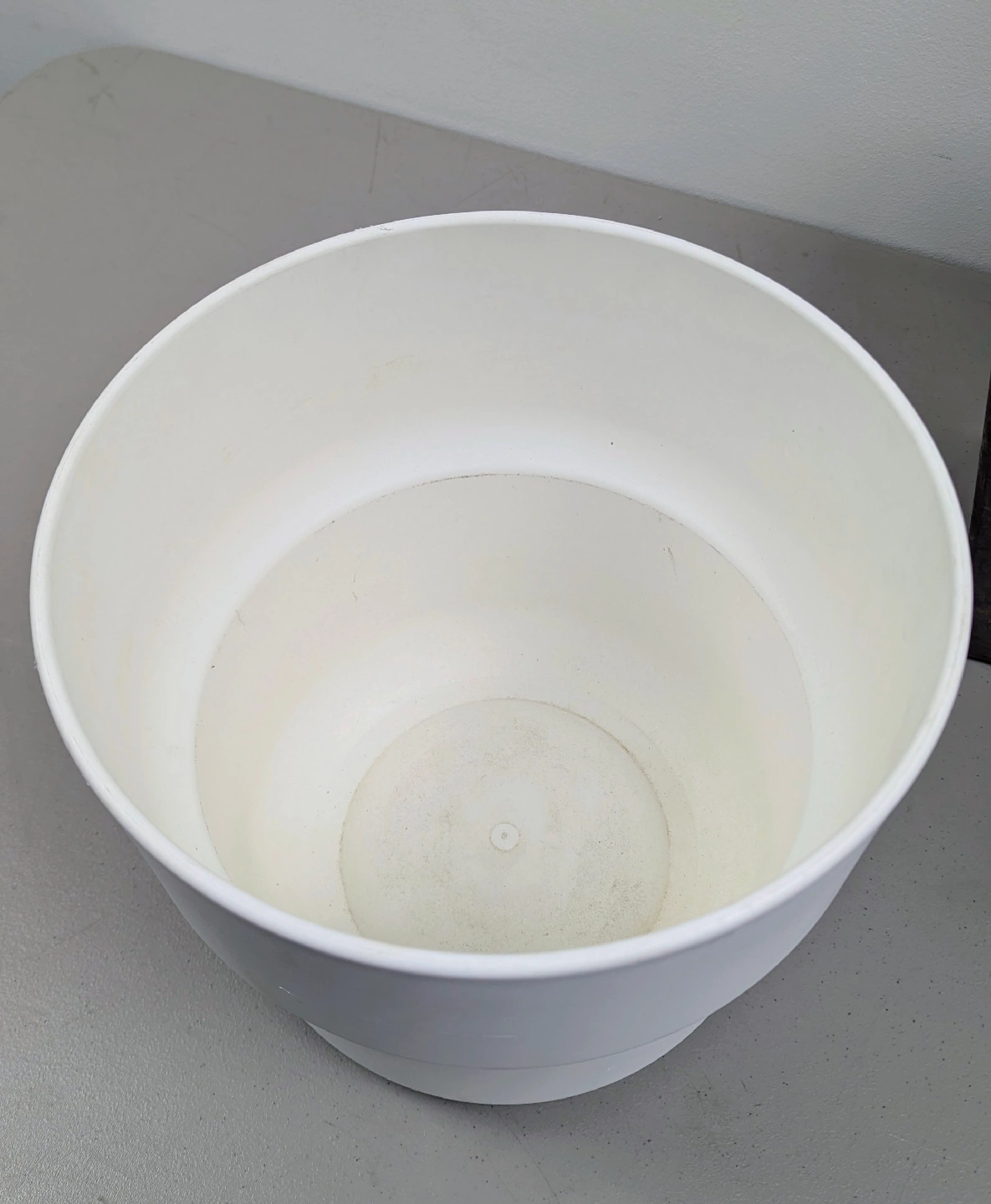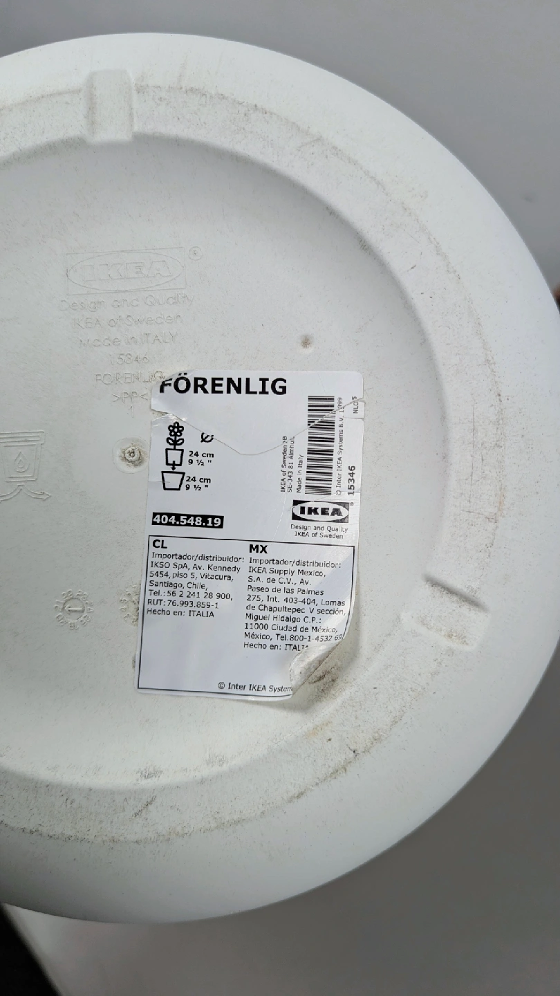 White planter - Ikea Forenling. 10" opening. Dirt on bottom and inside, but not on sides where it counts. Paid $20 + tax.