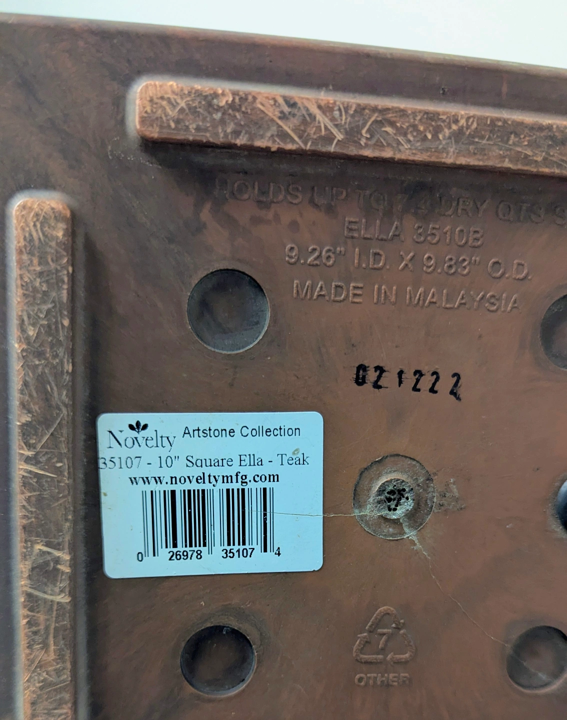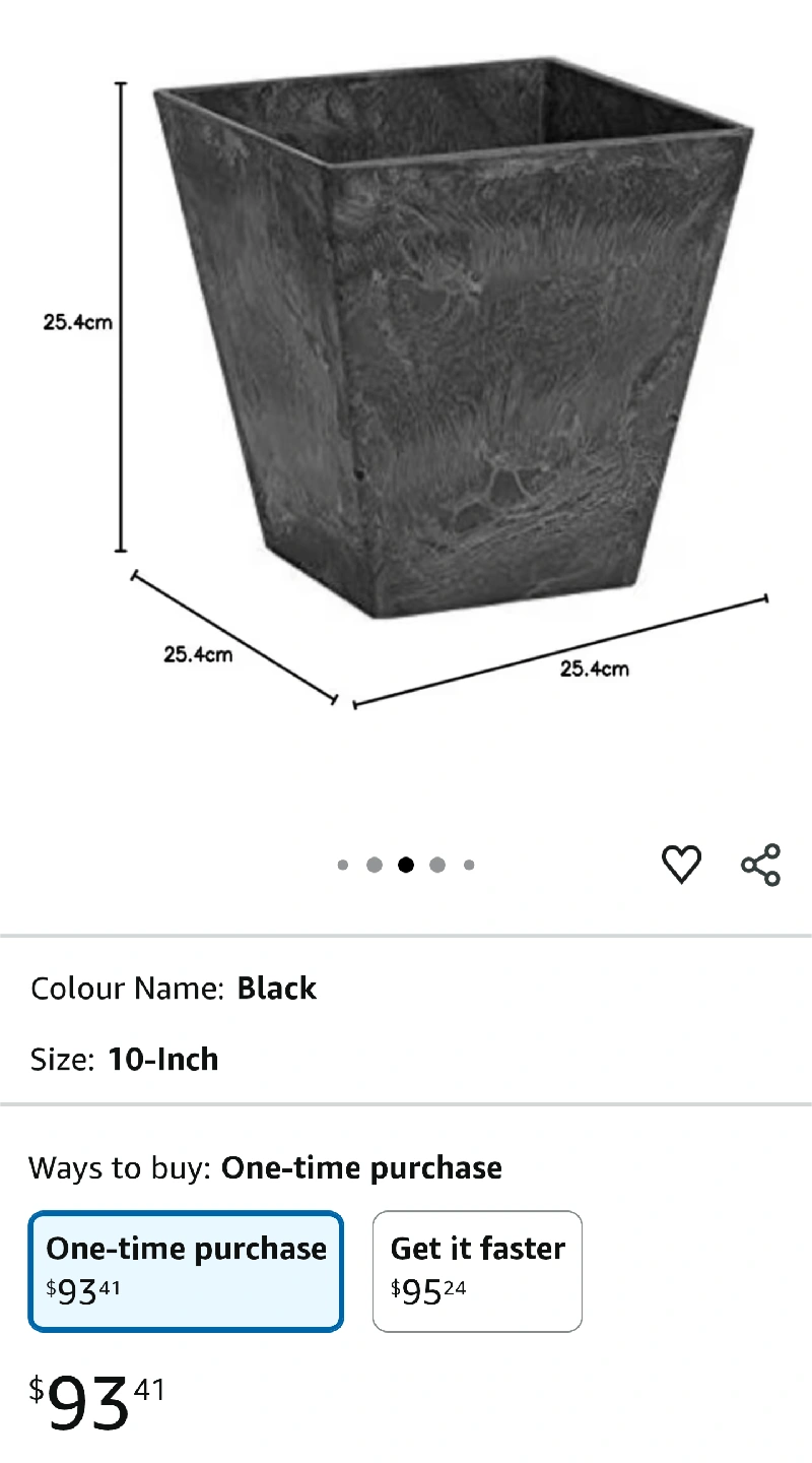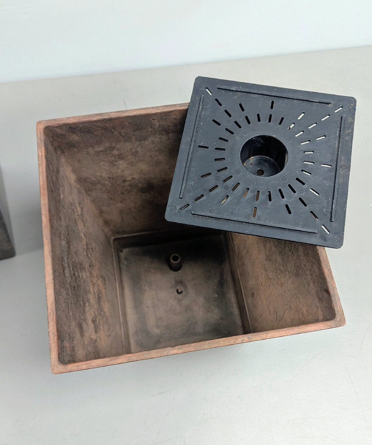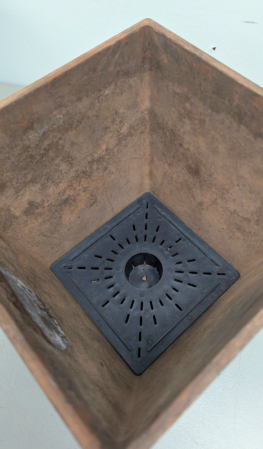 Two square planters - Square Ella Planter, Model #35108. Teak colour. 10" x 10". Paid $90 + tax on Amazon (each). Sticker marking on one (see pictures). These planters include a trap at bottom to prevent overwatering. Slightly different in colour as each piece is original.
