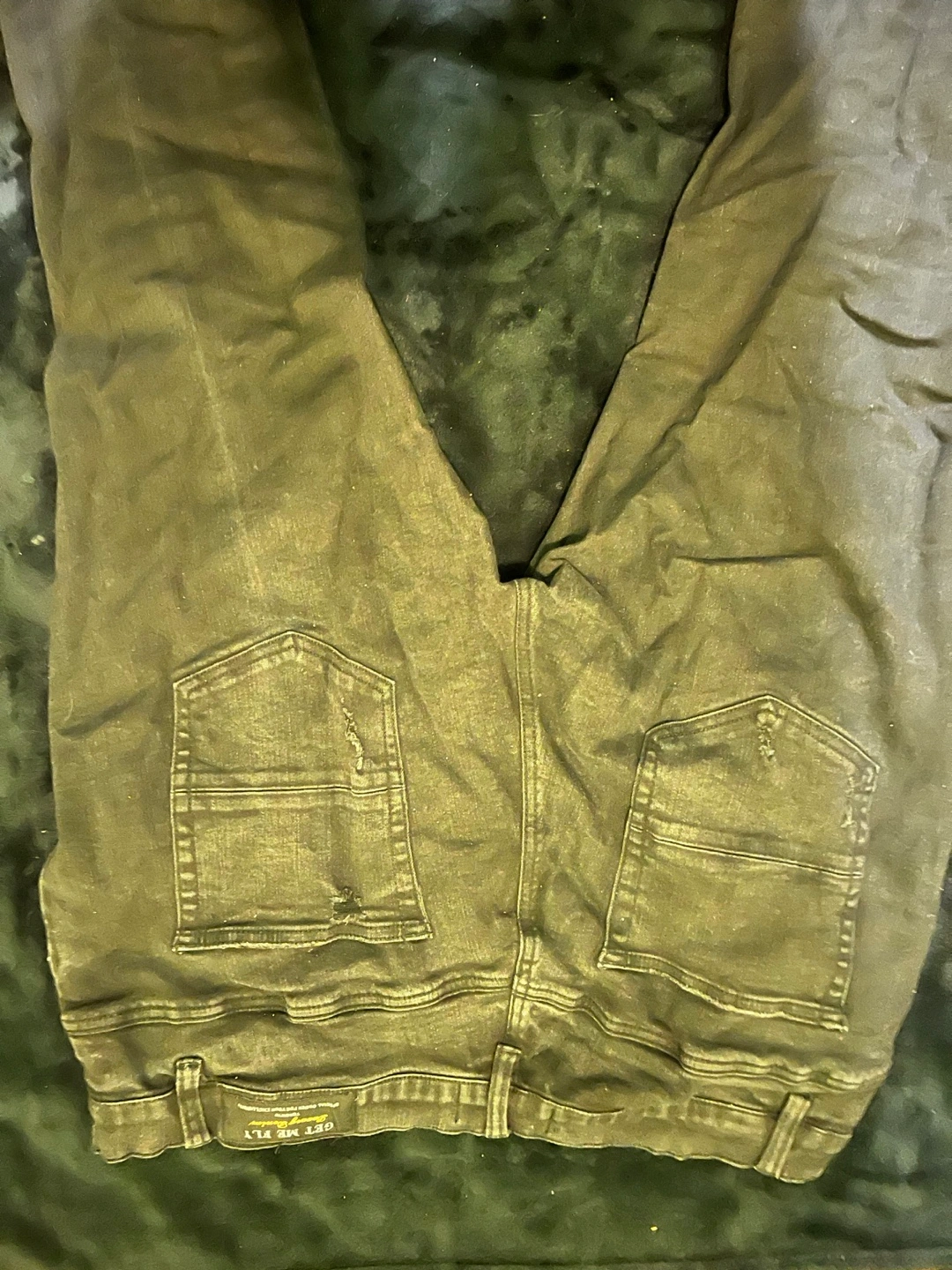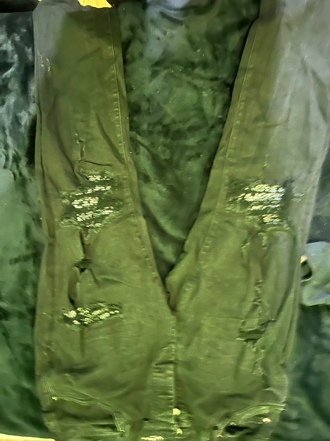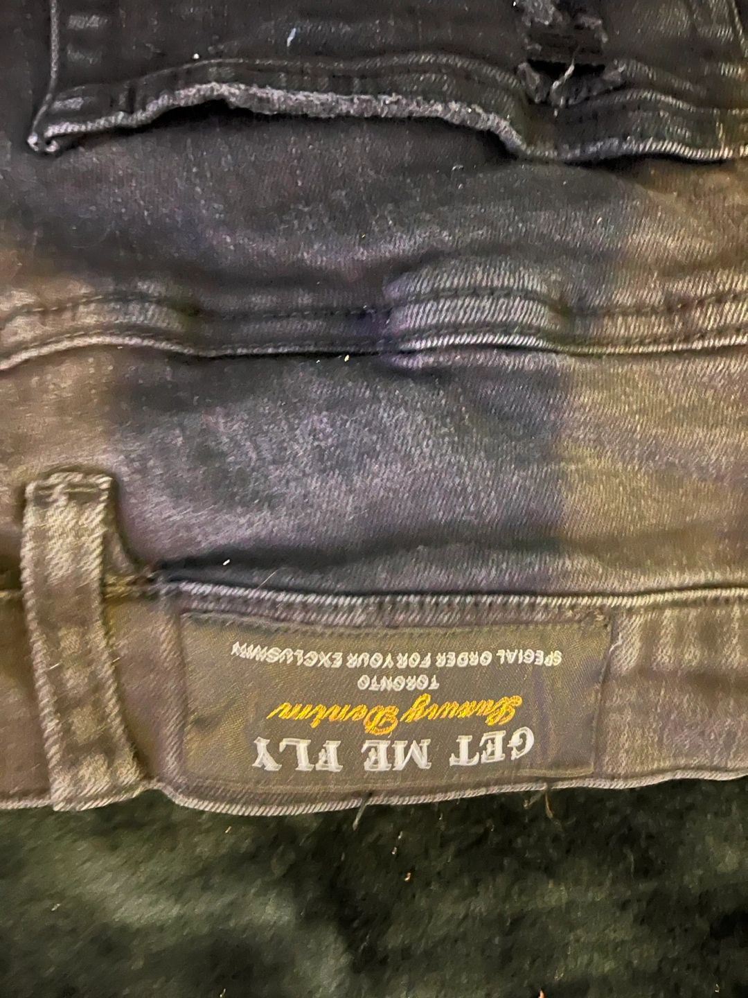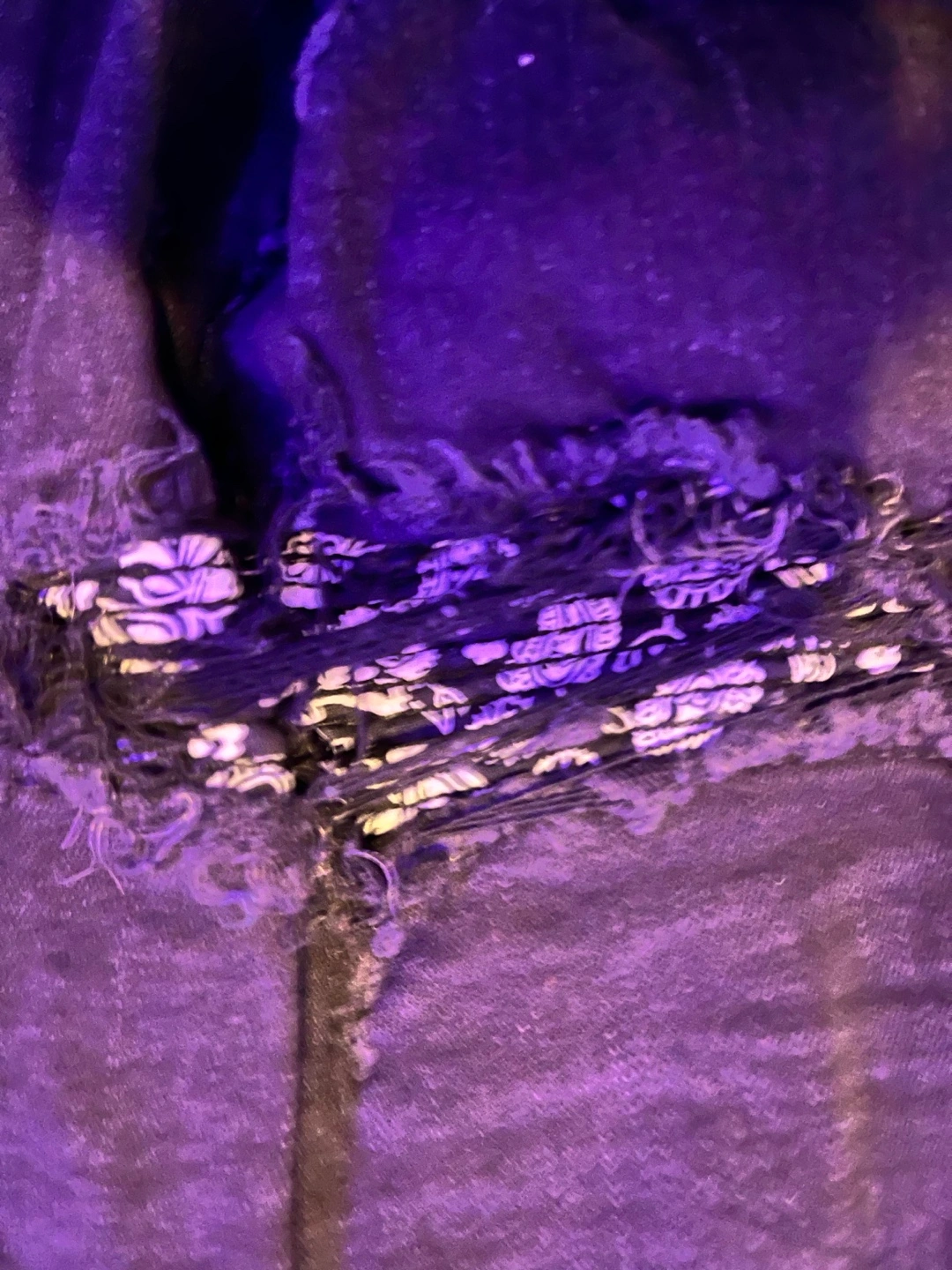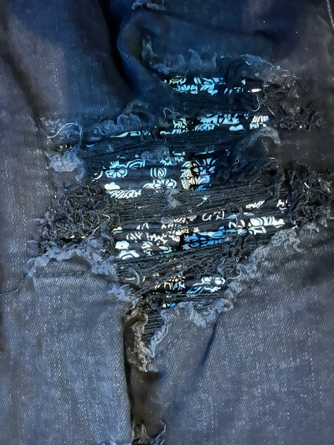 Black denim jeans with intentional distressing and rips. Features a bandana-print patch on the knees.