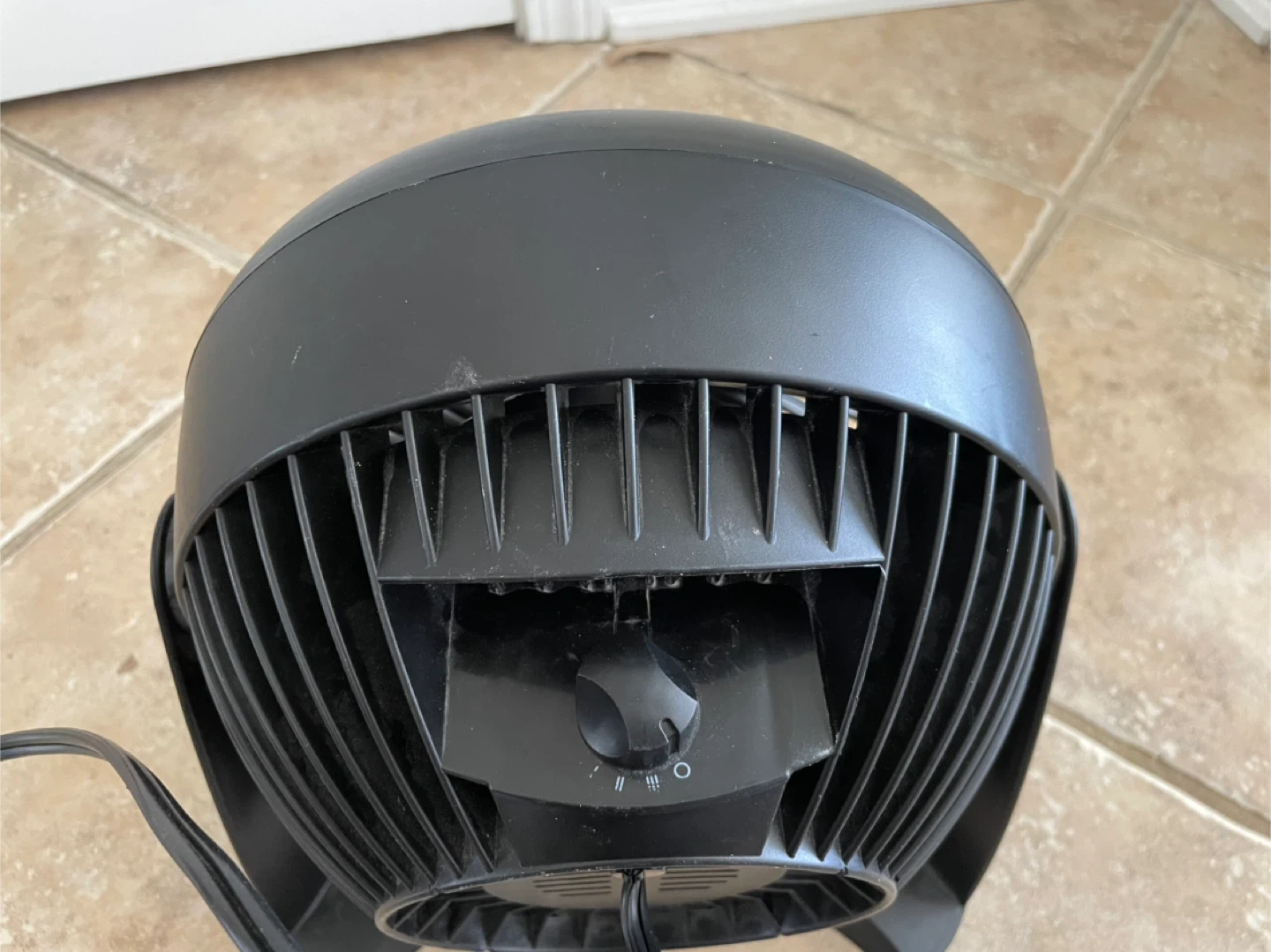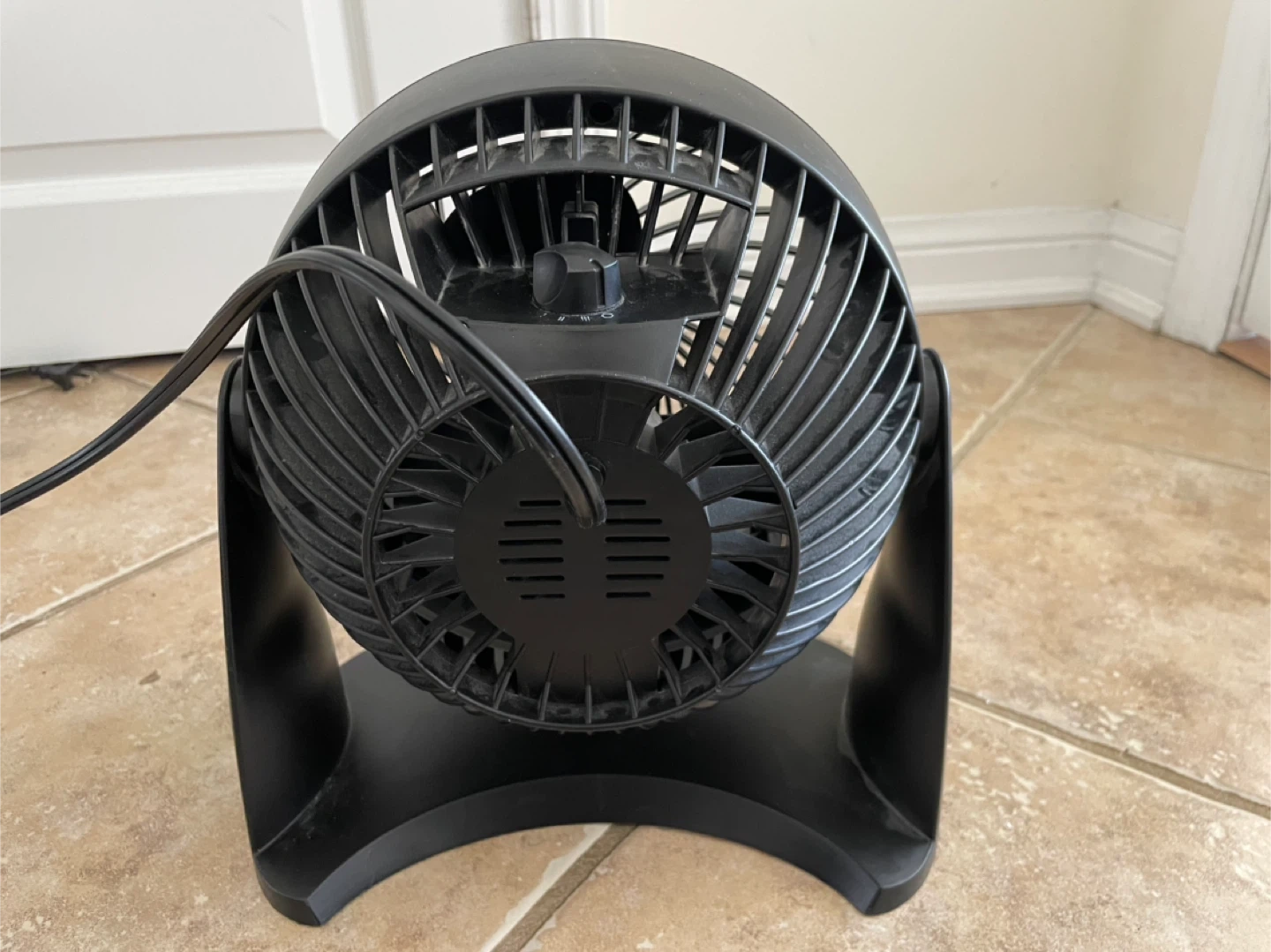 This is a black Honeywell turbo fan. It has a round grill and a sturdy base. It features multiple speed settings. It's a compact fan that's great for a desk or small room.